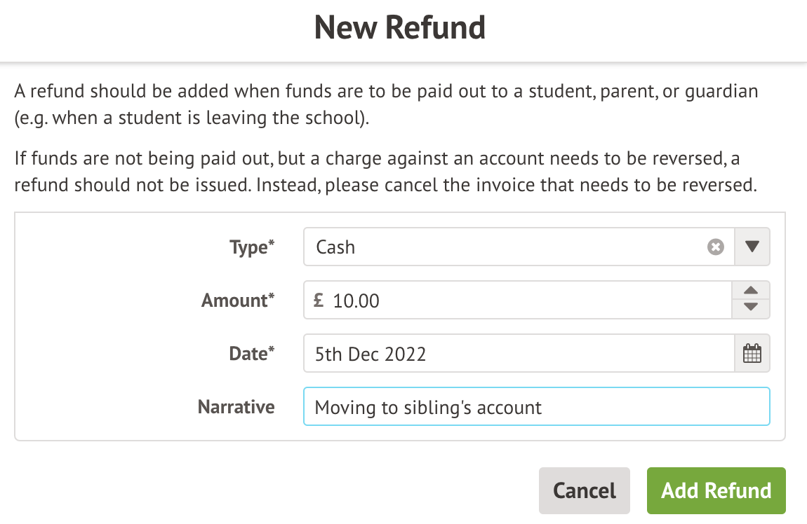 Add a Narrative to clarify why the refund was issued for future reference (e.g. "Moving to siblings' account" or "Moving to Wraparound account")