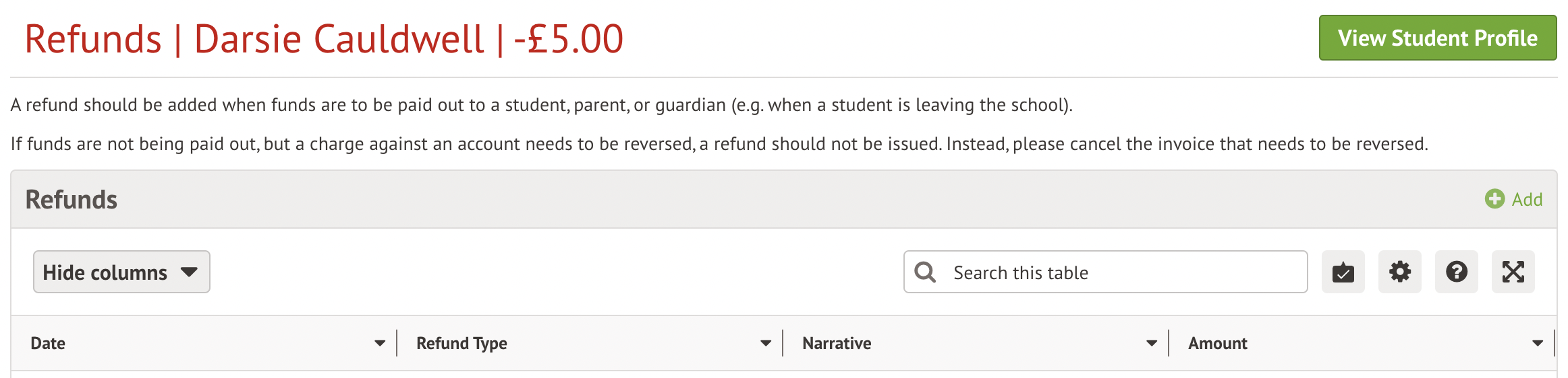 You can also do this from the student's Student Profile - select Payments from the left-hand menu, select the account and go to the Refunds page.
