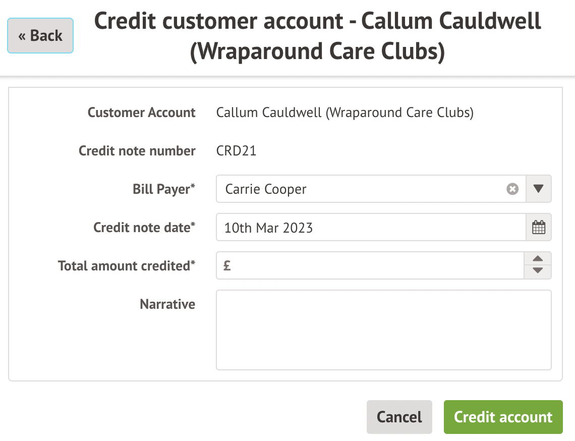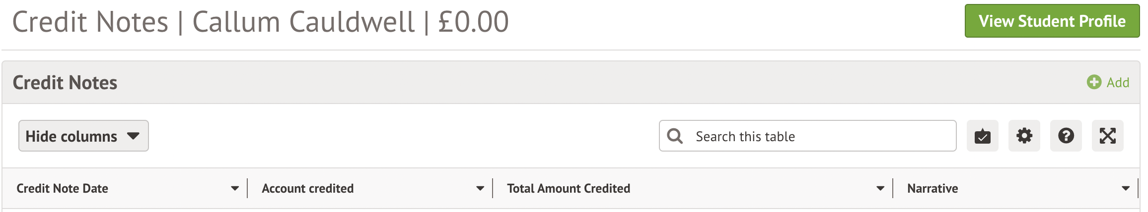 - Next, head to the other student profile or other customer account type and select Payments from the left-hand menu, select the account and go to the Credit Notes page.