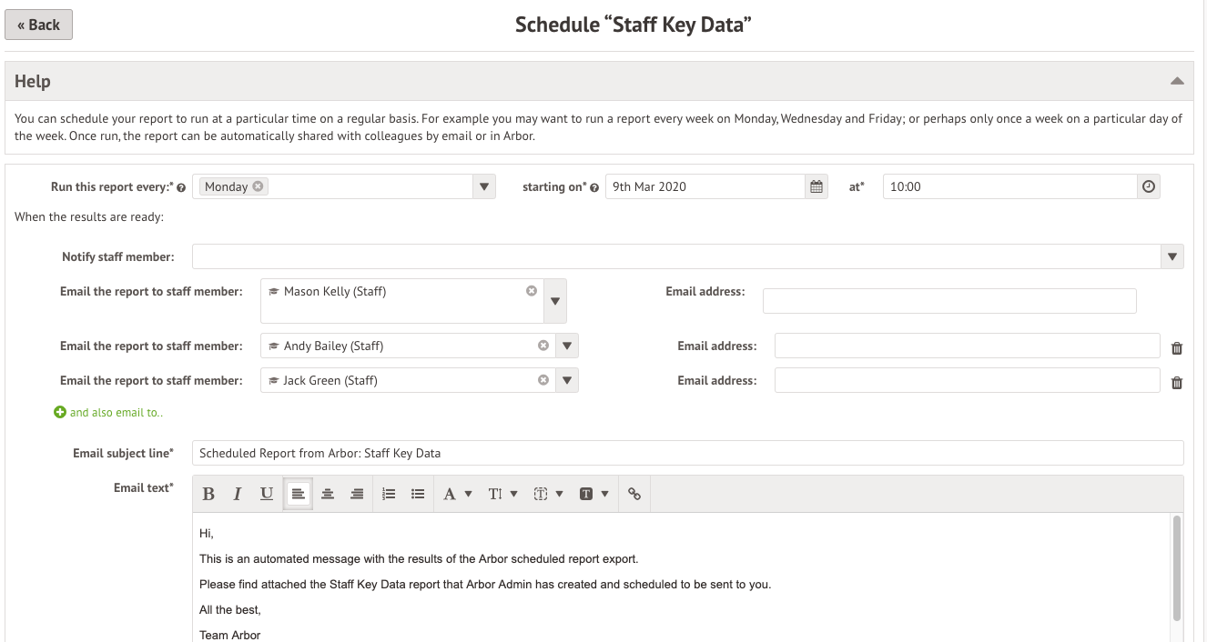 Select the report to run on the day you require and choose the first day to run the report and the time. Choose a staff member to email or add an email address to email. You can then choose the message and schedule the email to be sent to the selected recipients.