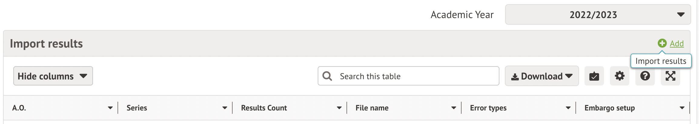 To import your downloaded XML results file go to Students > Examinations > Results Administration > Results Import. Then click on +Add to import a file, this will display a prompt to choose your file.