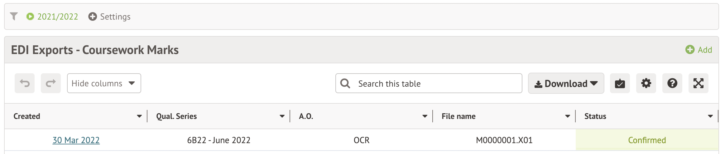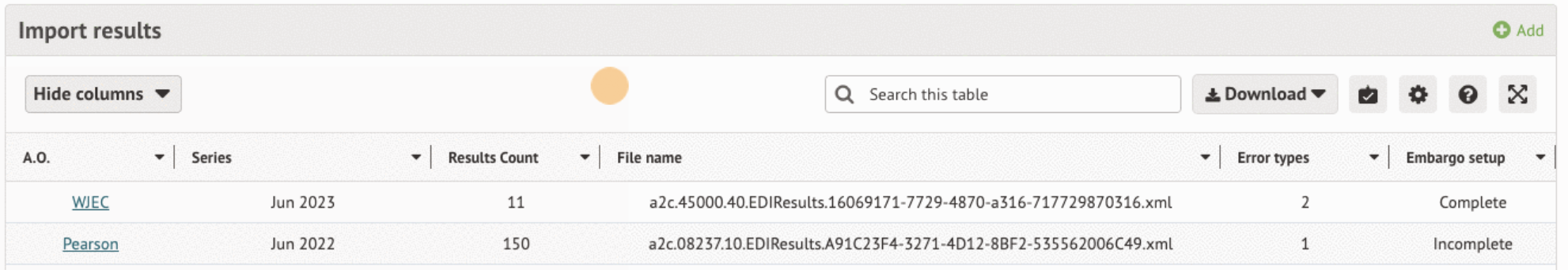 Click +Add to generate a new file. Select the Awarding Organisation and the Exam series to export results for.