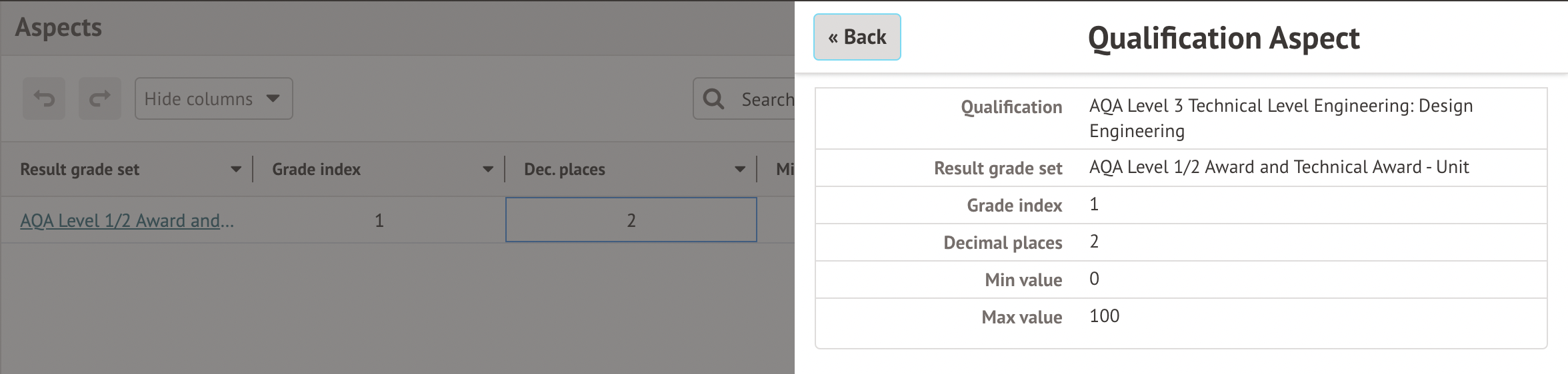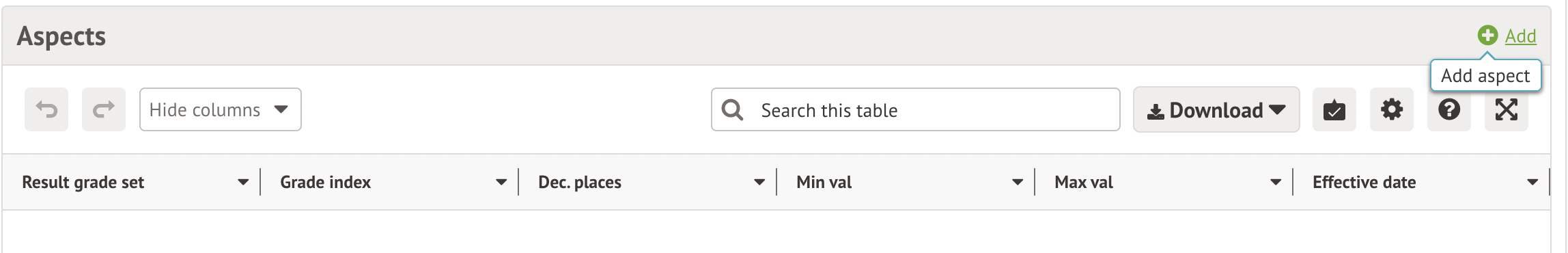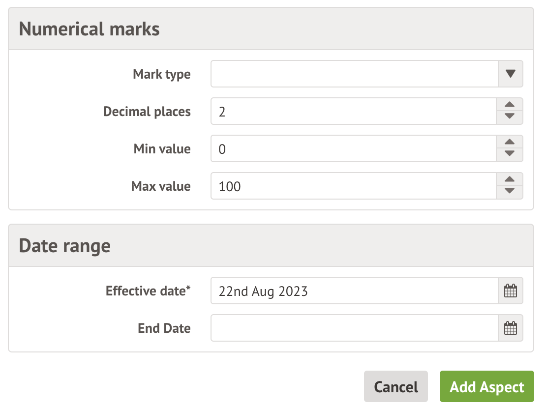 In the slide over, select the grade set to preview the available grades, then choose your numerical mark settings and the dates that should apply. Then click Add Aspect.