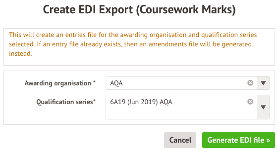 Once you have entered all coursework marks, go to Coursework > EDI Exports > Coursework marks to generate your Coursework Mark EDI file to submit to the correct Awarding Organisation.