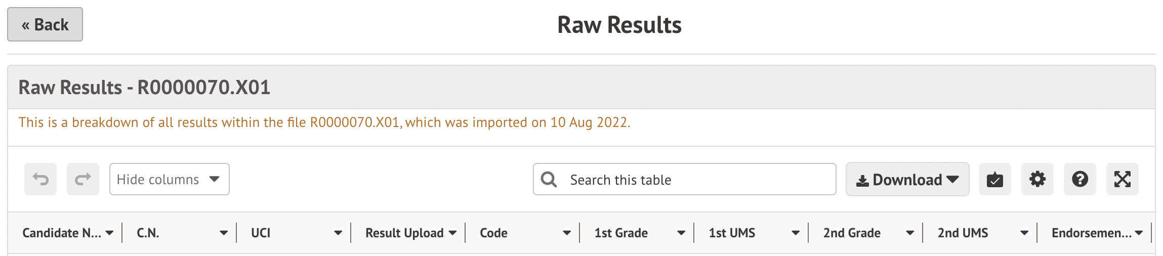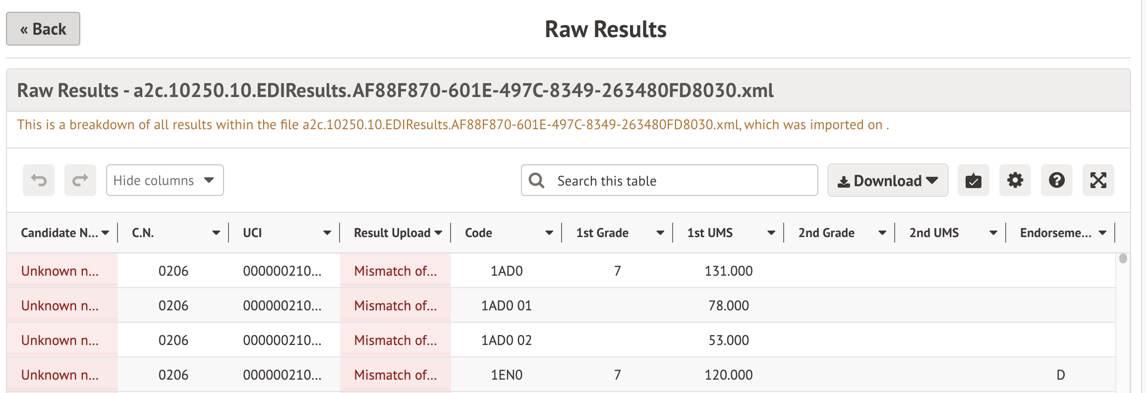 EDI results files contain information about the students' overall grade awarded for the award. The file will start with the letter R followed by some numbers and end with .X01.