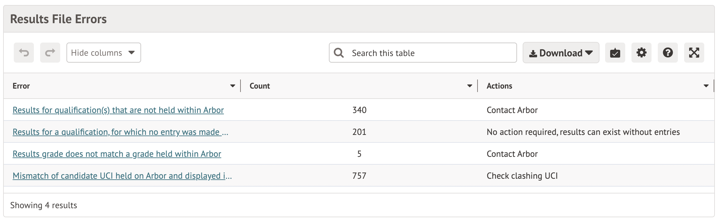 - Error 1 - You can get this error if the candidate has results but isn’t entered on Arbor and the qualification doesn’t exist. If the file is for a Pearson BTEC, please delete the file, and import your centre-specific basedata. Once done you can import the results file again. For other qualifications, please contact the Arbor Support Team and reference code 1040 if supported by Arbor, or your Support Partner if not supported by Arbor.