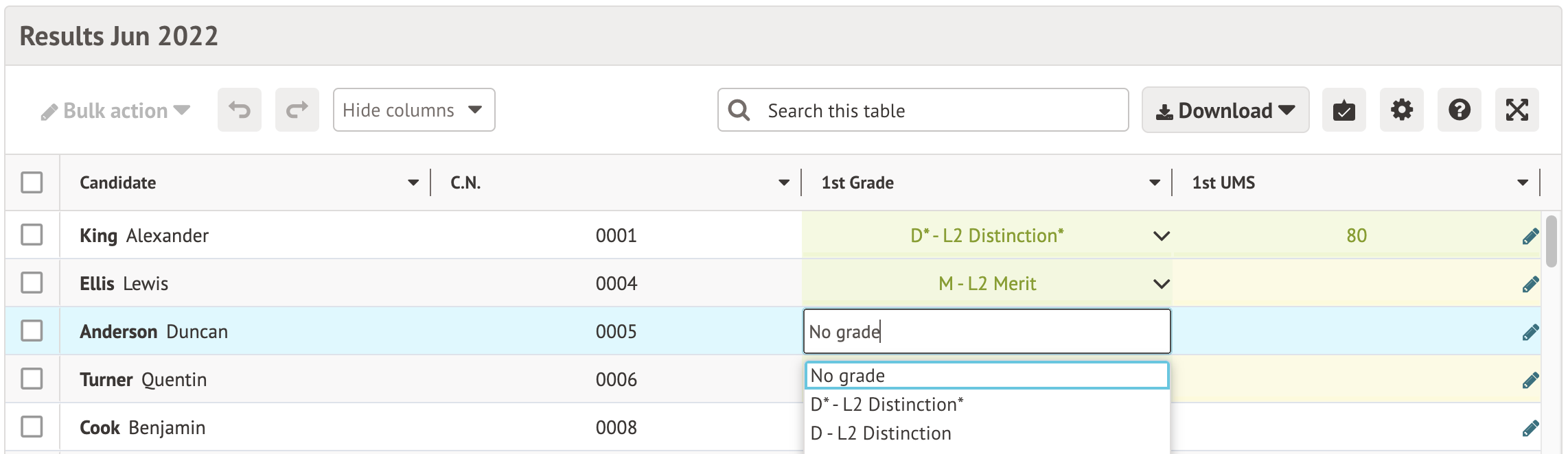 You can then enter results for the candidates by clicking in the drop-down and choosing the correct option, or you can paste in the values from an external sheet.