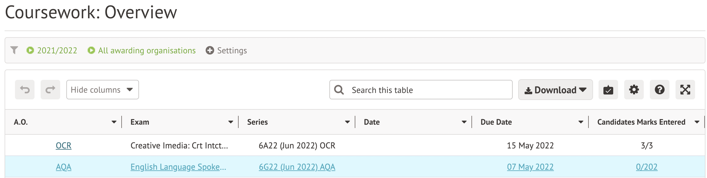In the final column, you can see the number of candidates that are entered for the coursework exam and have had their final coursework marks recorded.