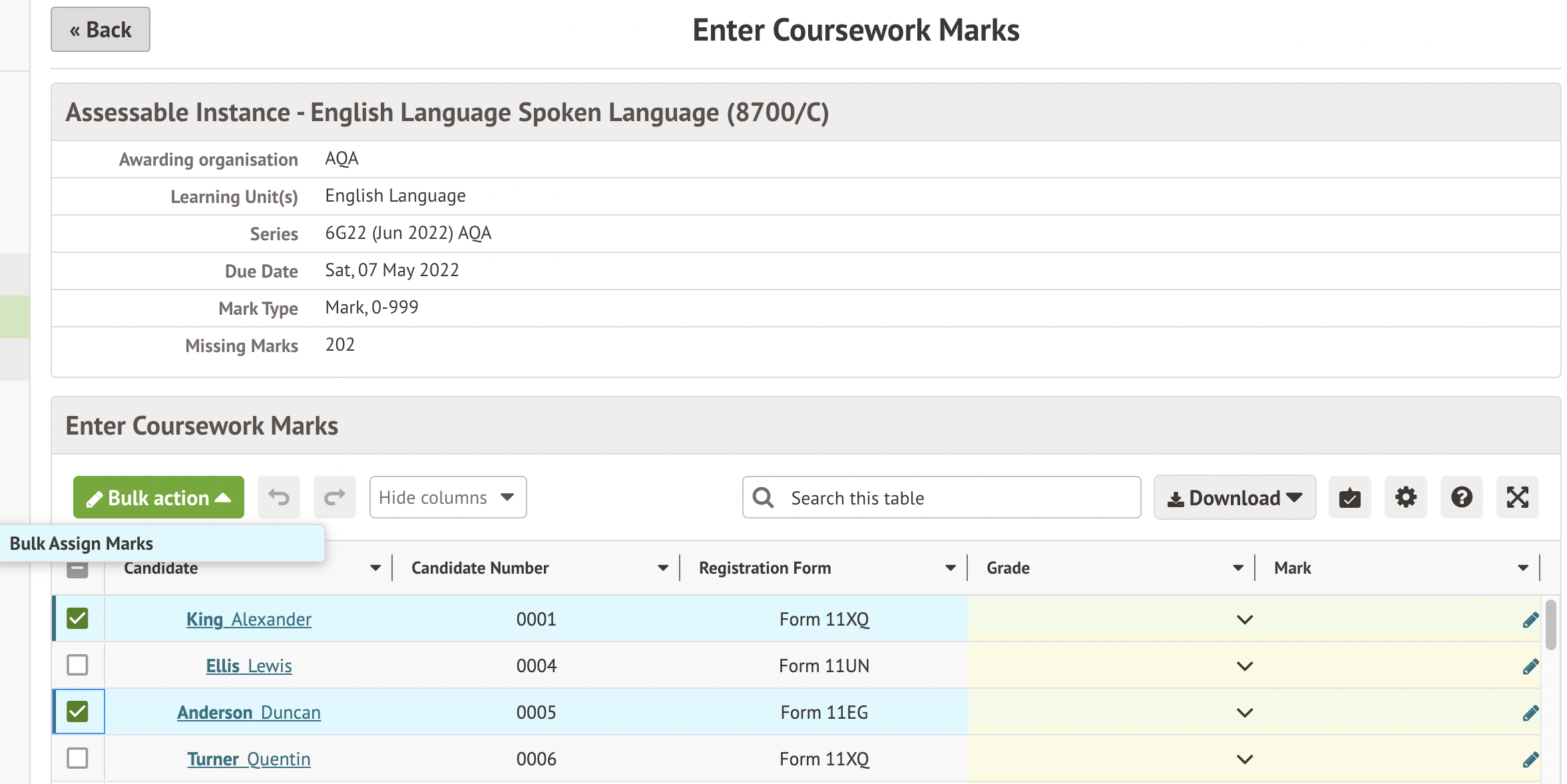 - You can also bulk assign marks by selecting the students and clicking the Bulk action button to Bulk Assign marks. You can then select a grade in the slide over.