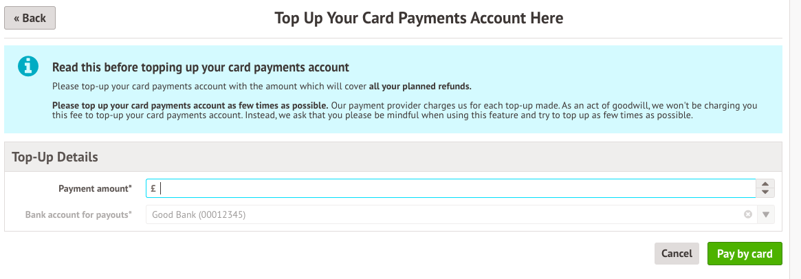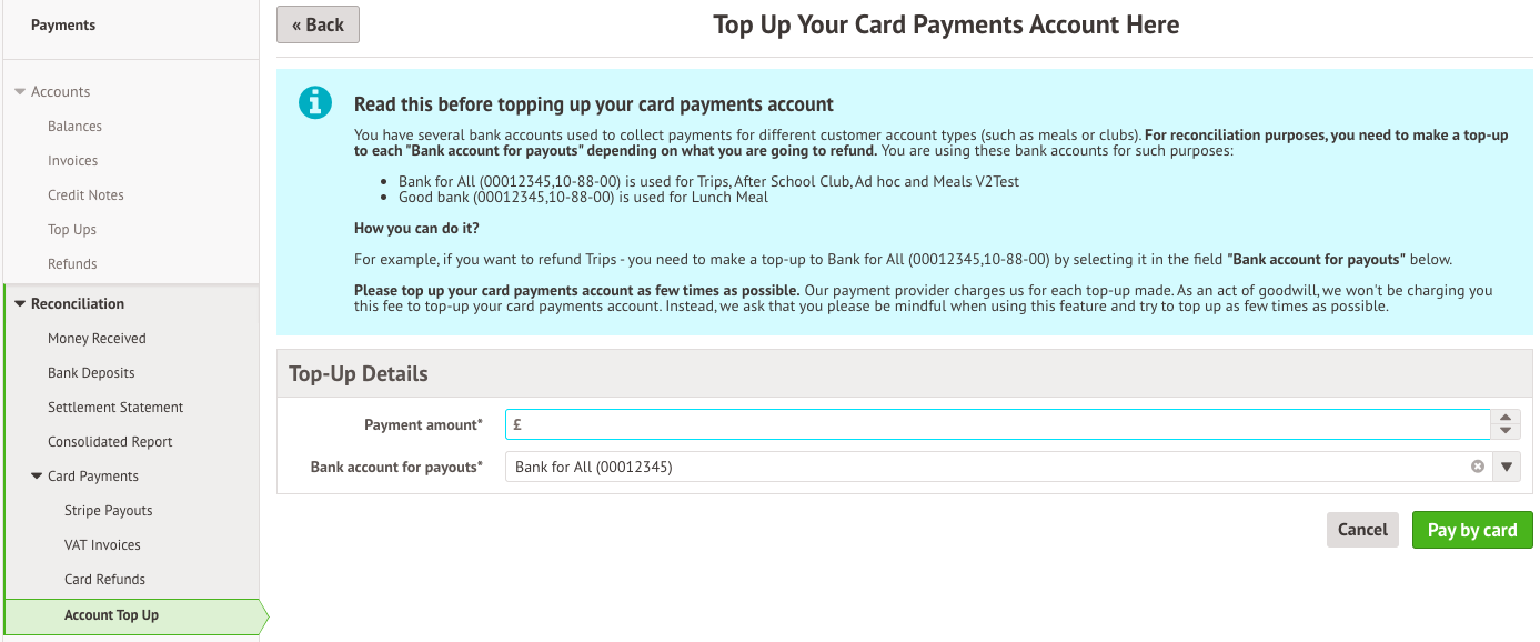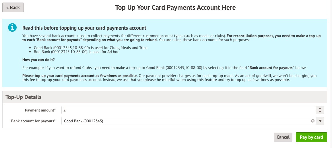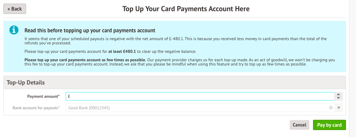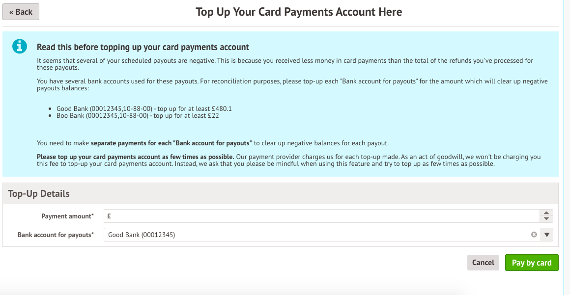 If you only have one bank account for payouts with a negative balance , you'll just need to specify the amount you want to top up, then click Pay by card. You'll then see a pop-up where you can enter your school bank account details.