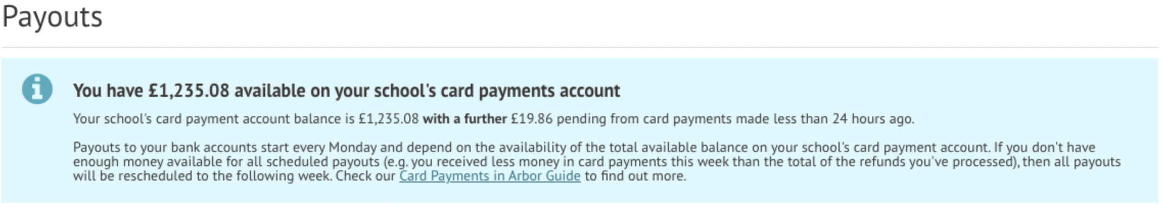 During a normal school week, top-ups and payments are made to your card payments account in Arbor, and any refunds are paid out from this amount. The final amount at the end of the week is then paid out to your school’s bank account.