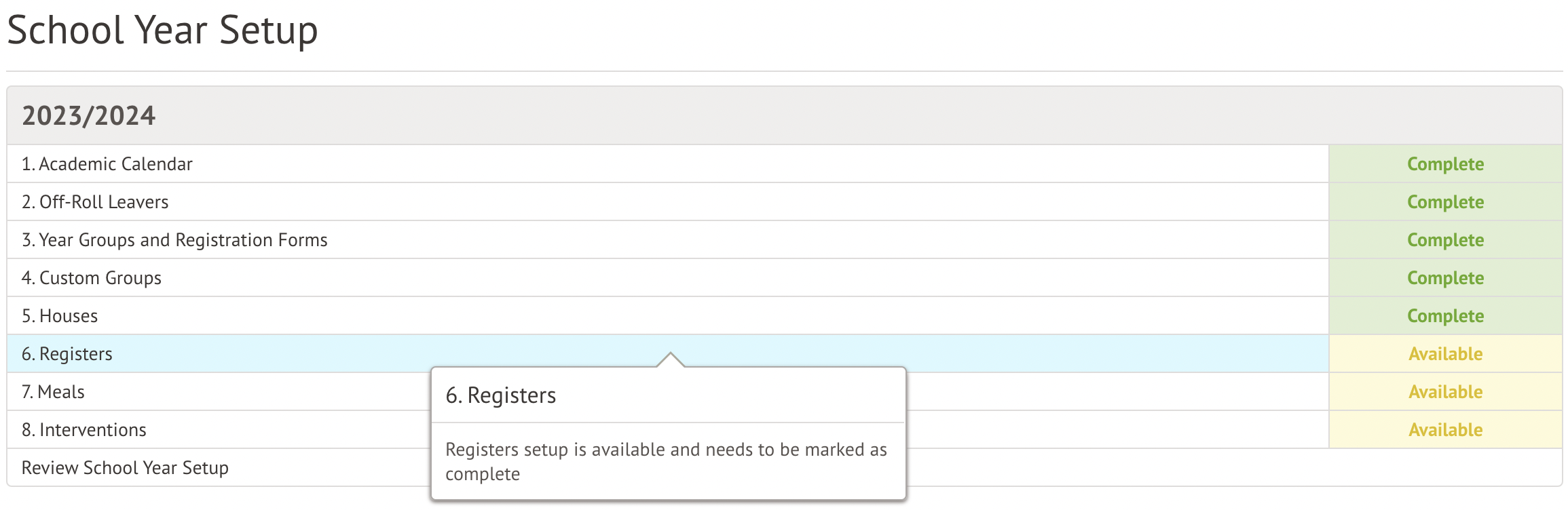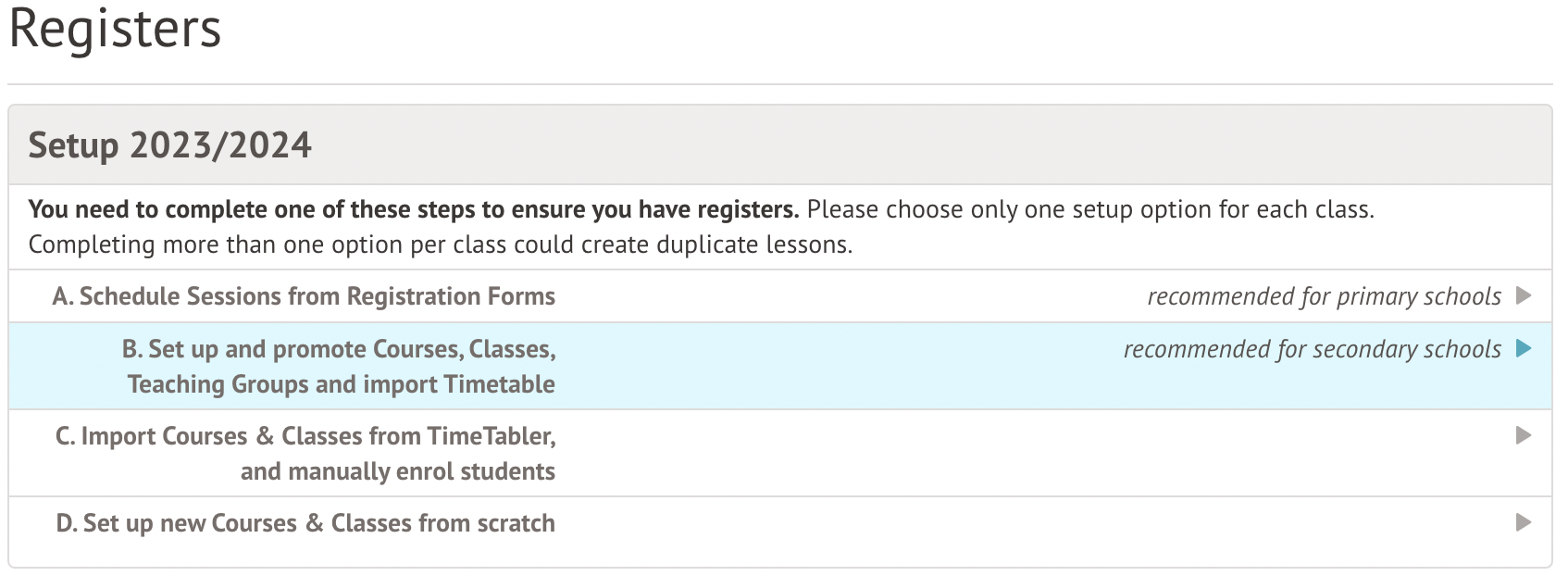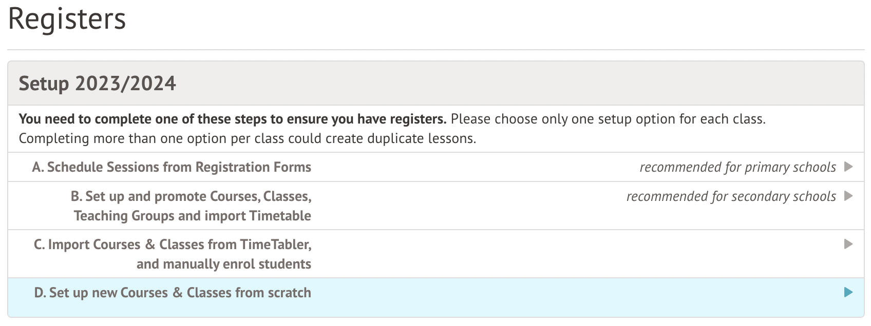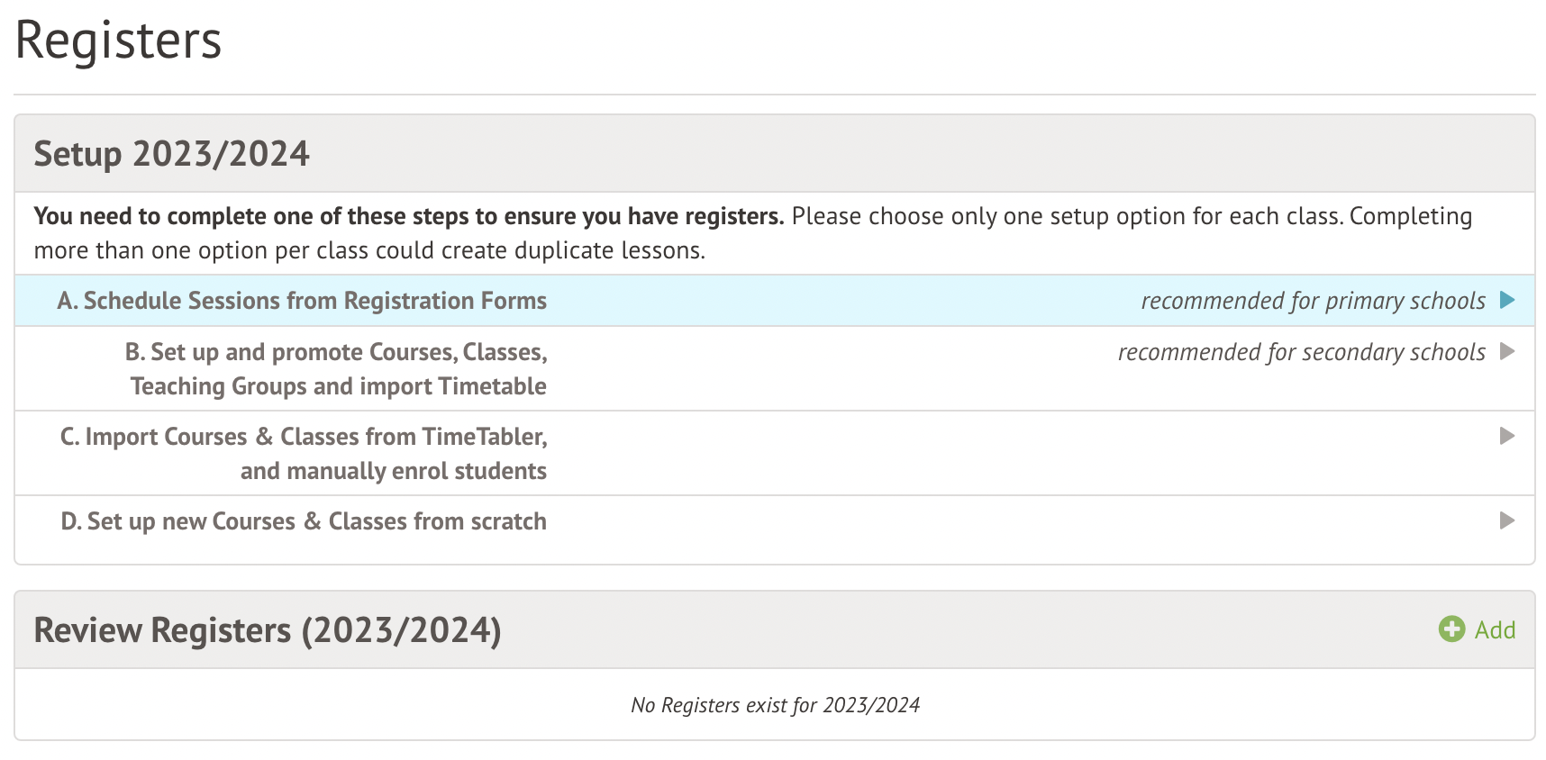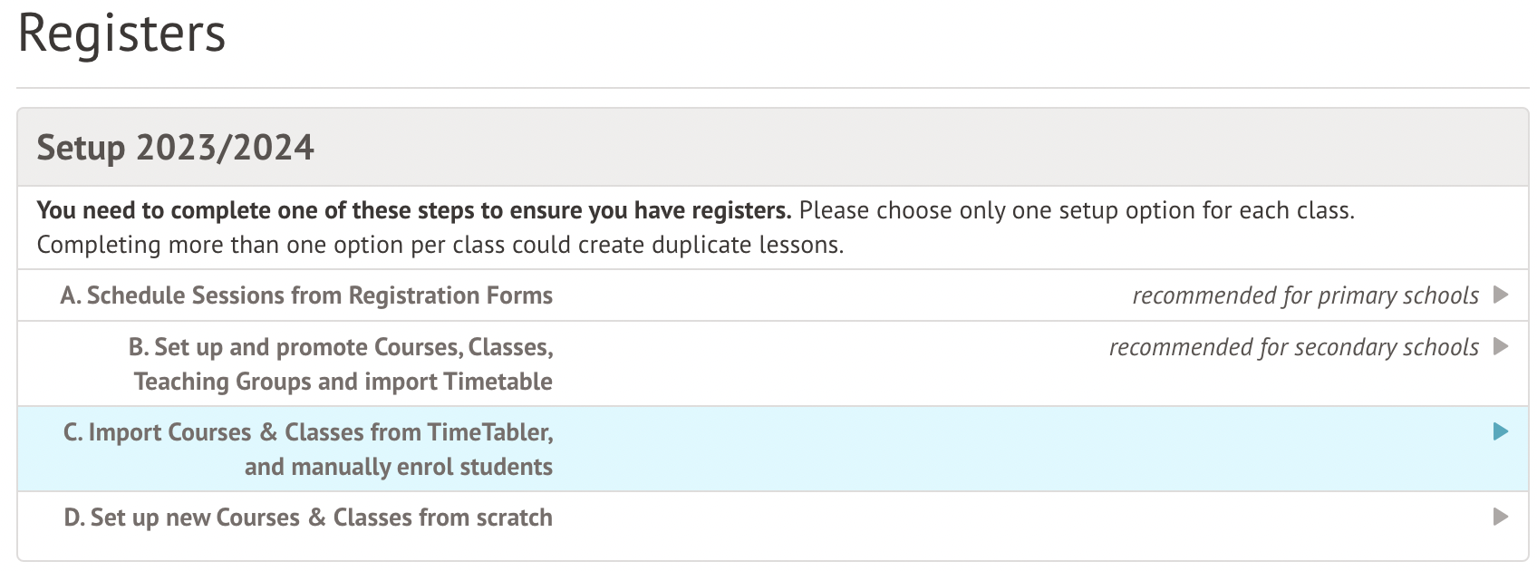 If you haven’t imported a timetable from TimeTabler, your courses will show that they don’t have lessons within 6. Registers section of the main New School Year Setup.