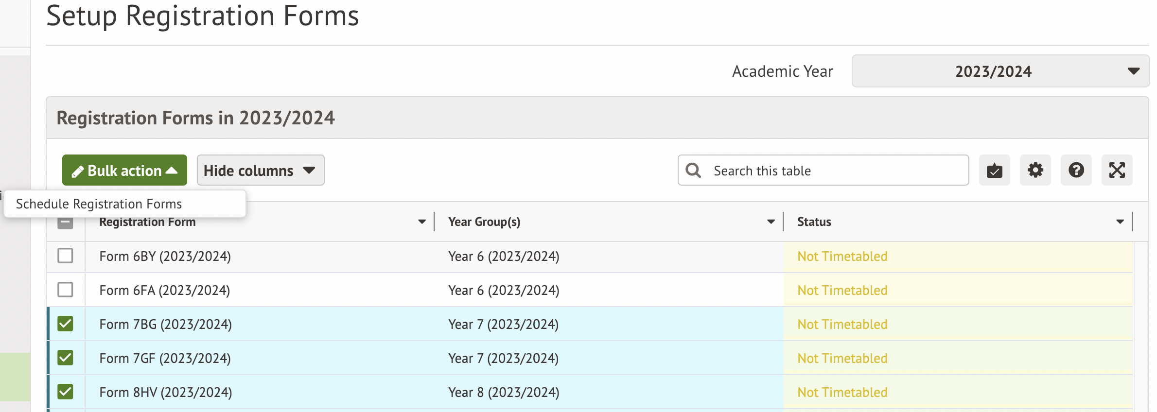 This will bring you to a list of all the registration forms you have. Select the registration forms, then click the Bulk action button to select Schedule Registration Forms.