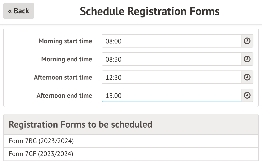 A slide over will appear where you enter the start and end times for the Registration Forms you have selected.