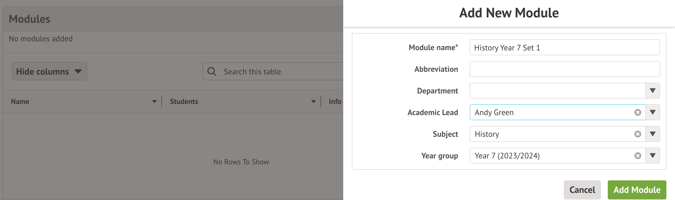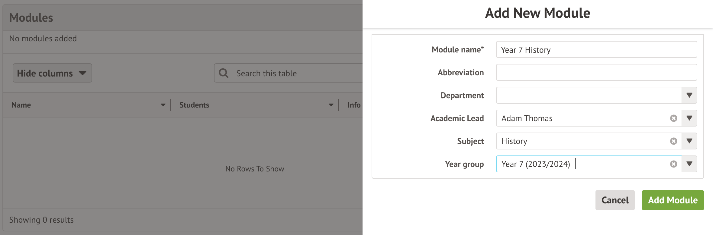 In the slide over add the name of the module and fill in the other details. In my example, year 7, 8 and 9 do this class so I’ll need to add a module for each. Select the year group then click the green Add Module button.