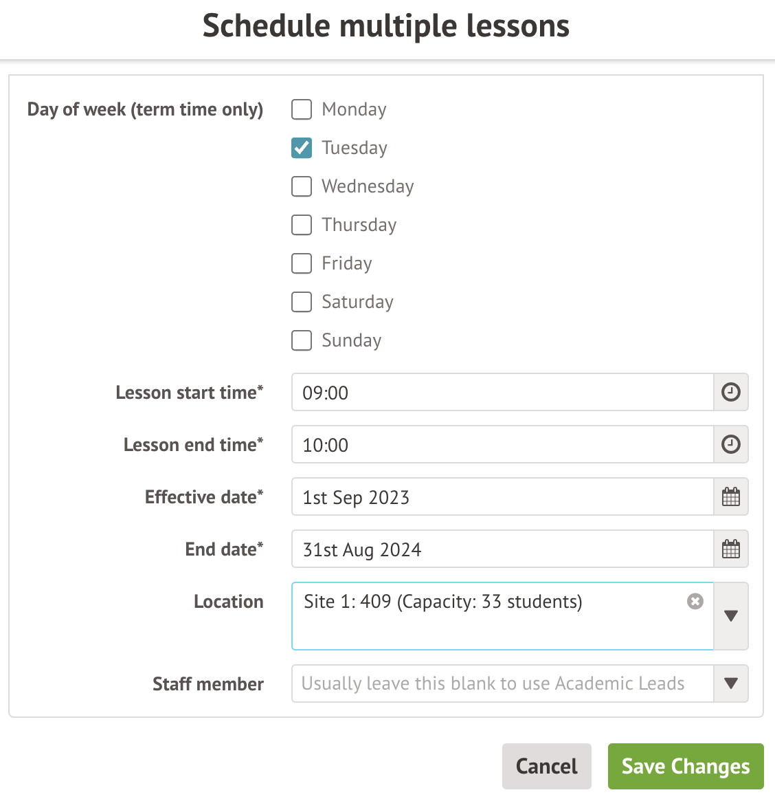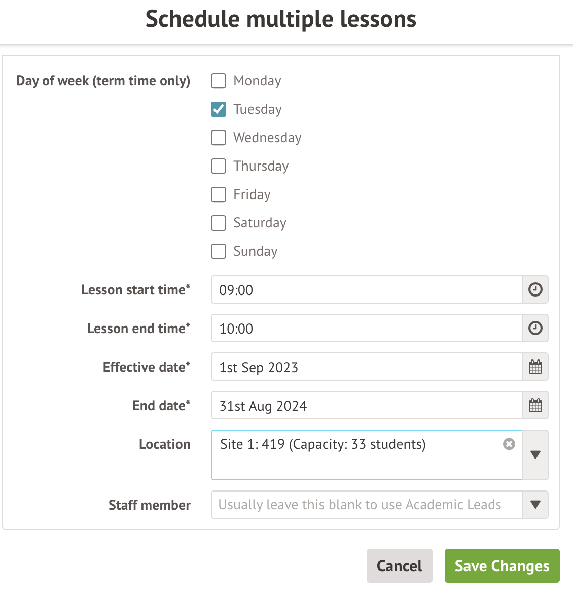 - If you don't use Edval or TimeTabler, you will need to go to School > Programmes > Courses > Next year Courses, then select the registration form. From the Classes and Lessons section, click +Add and then Schedule Multiple Lessons.