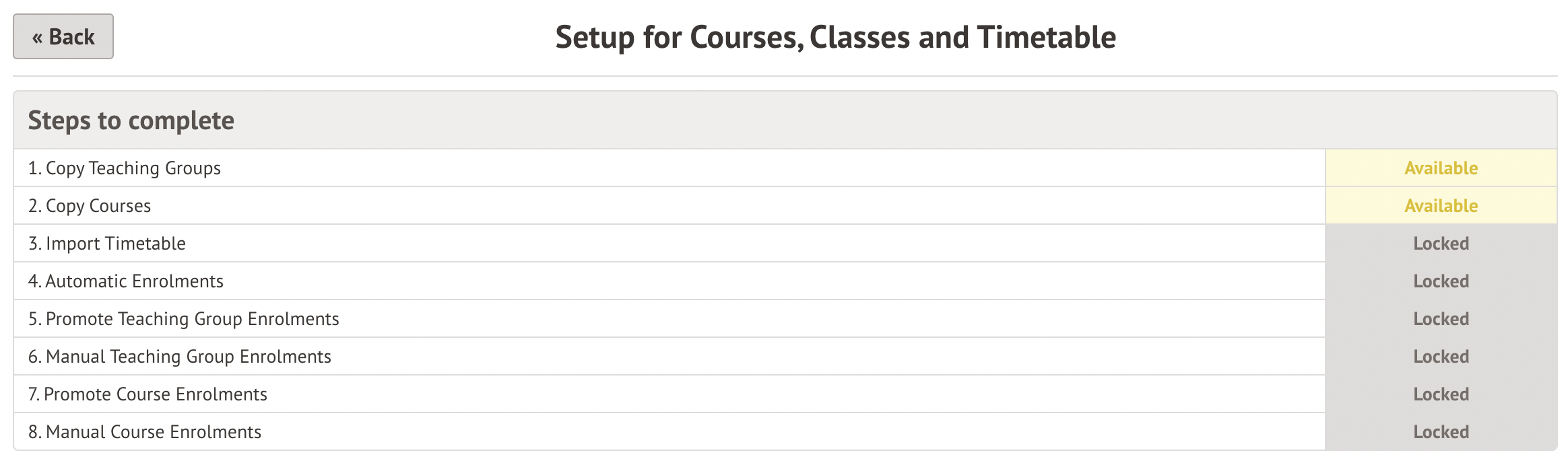 - Complete steps 1 to 8 in order, to copy courses and classes from the previous academic year, then import your timetable, then promote your students - this will copy the course structure from the previous academic year.