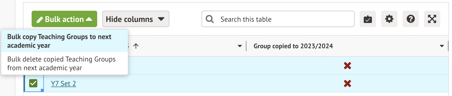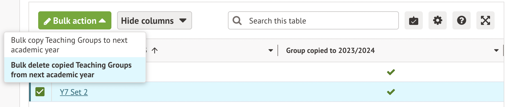 To delete any teaching groups from next year that you didn’t want to copy over, tick the box next to all the teaching groups you want to not copy over to the next academic year, then click the Bulk action button to select Bulk delete copied Teaching Groups from next academic year.