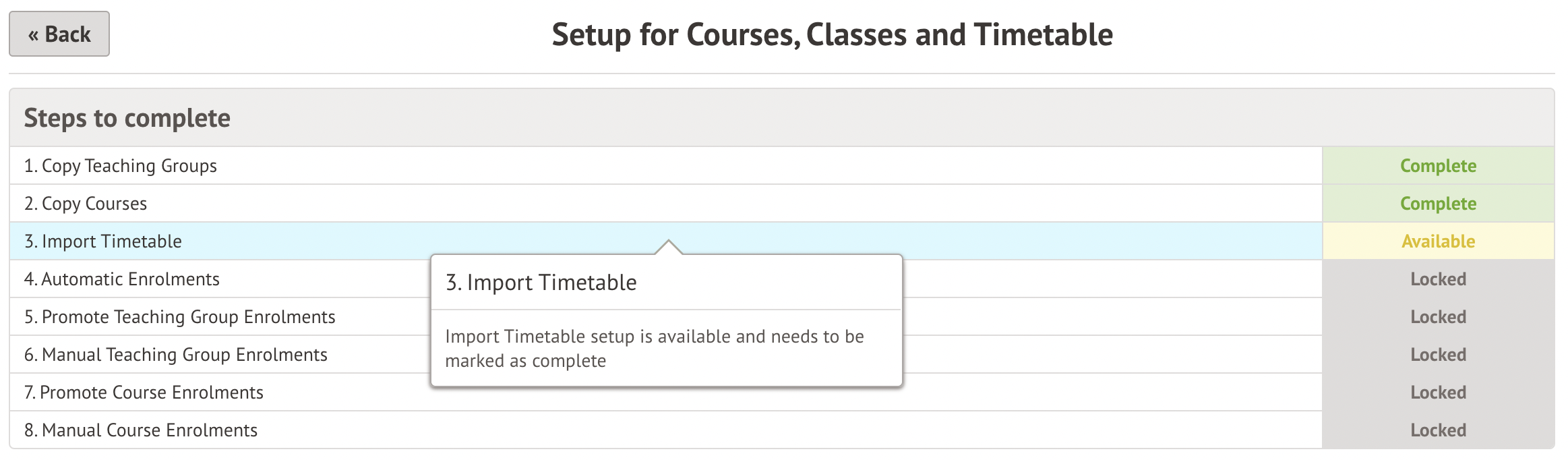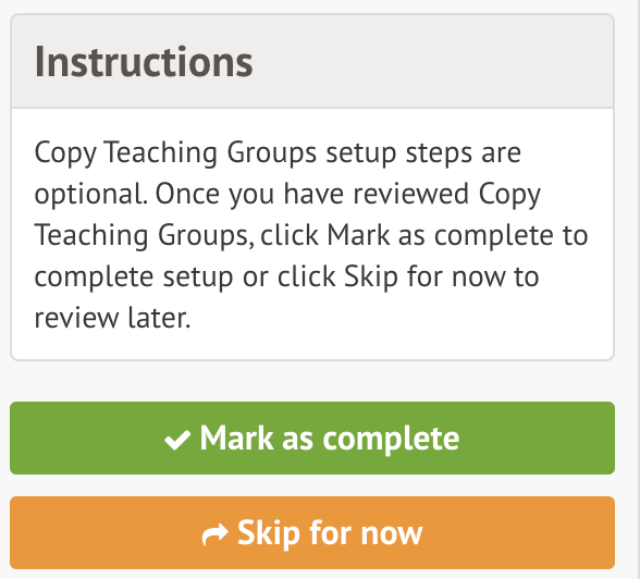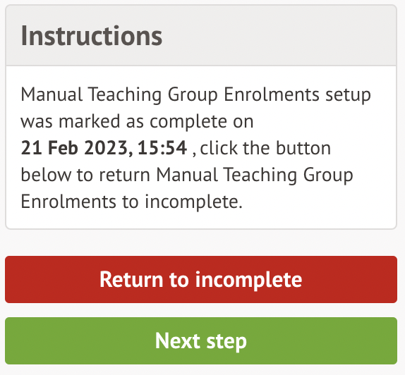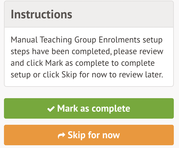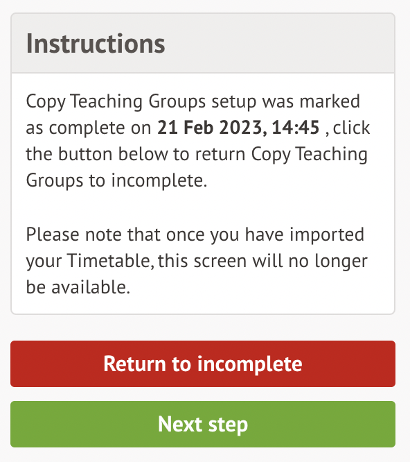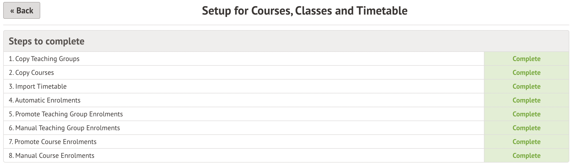 You can then return to School > School Structure > School Year Setup > Step 6 > B. Setup Courses, Classes & Timetable > 6. Manual Teaching Group Enrolments to mark this step as complete using the green button and move to the next step.