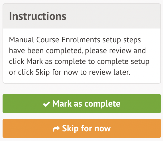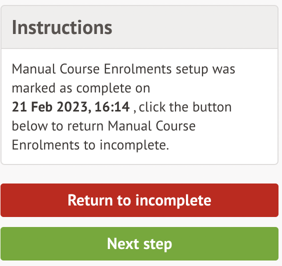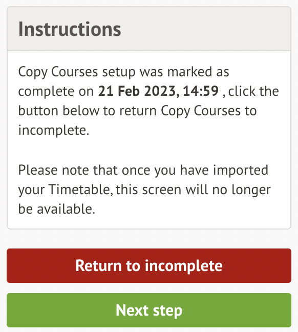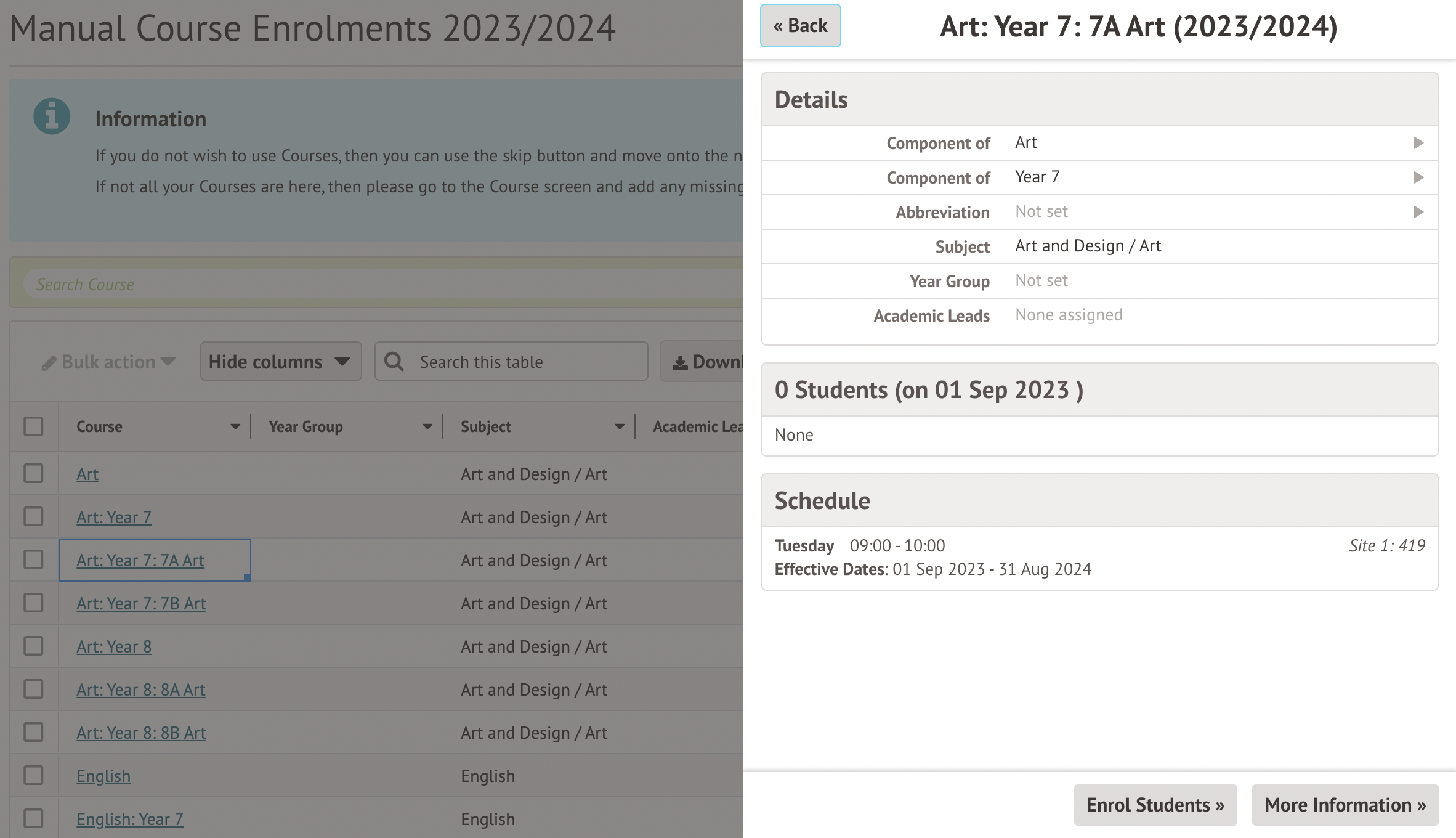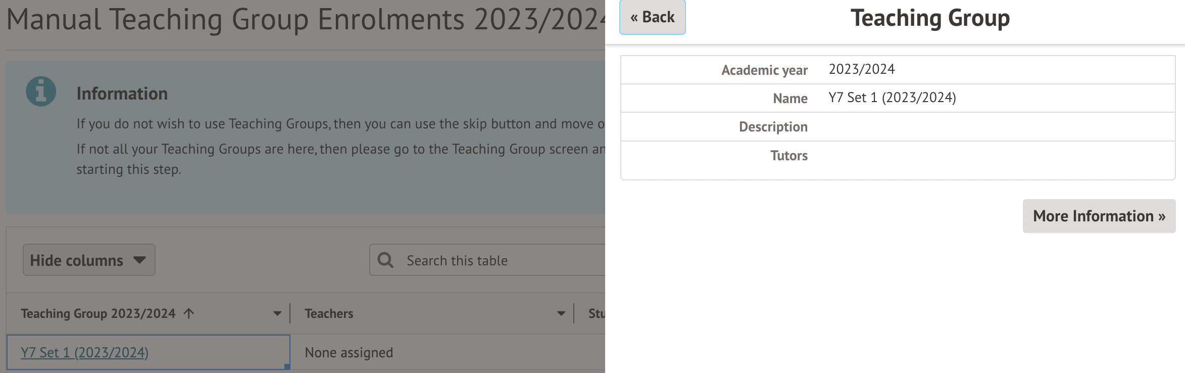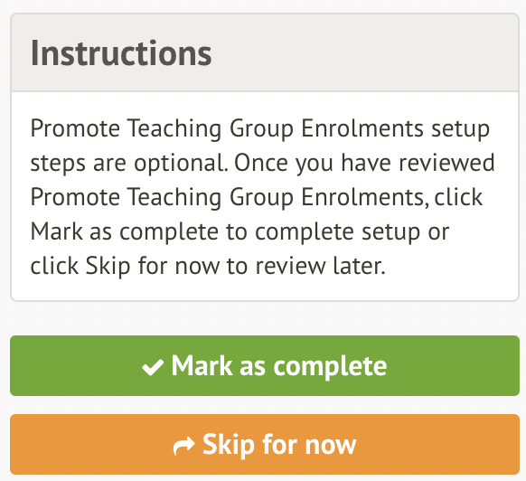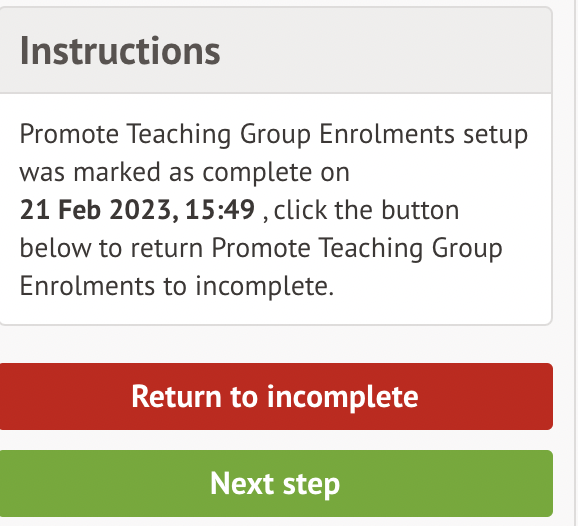 You can then return to School > School Structure > School Year Setup > Step 6 > B. Setup Courses, Classes & Timetable > 6. Manual Teaching Group Enrolments to mark this step as complete using the green button and move to the next step.