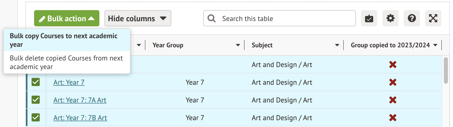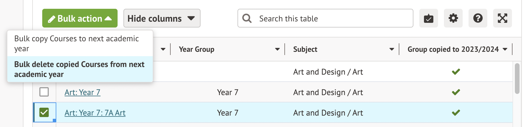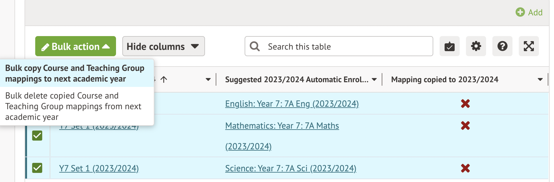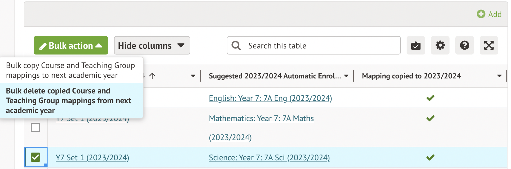 To remove any automatic enrolments set up in error, tick the box next to all the teaching groups you want to not copy over to the next academic year, then click the Bulk action button to select Bulk delete copied Course and Teaching Group mappings from the next academic year.
