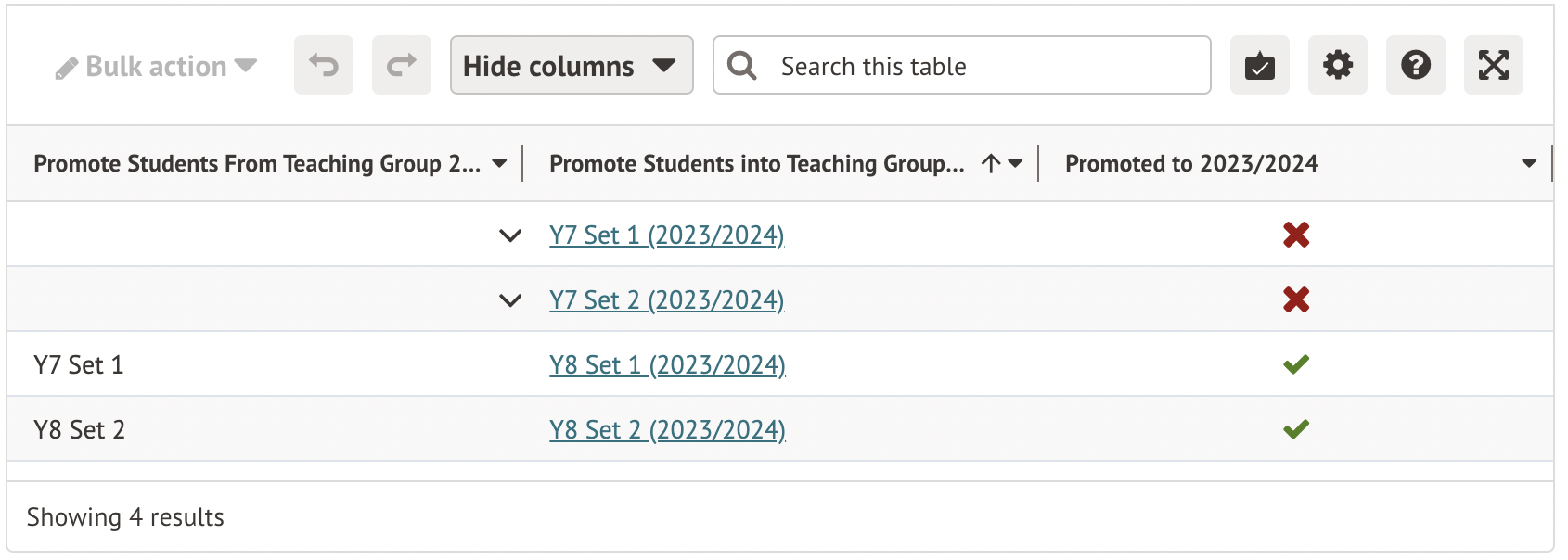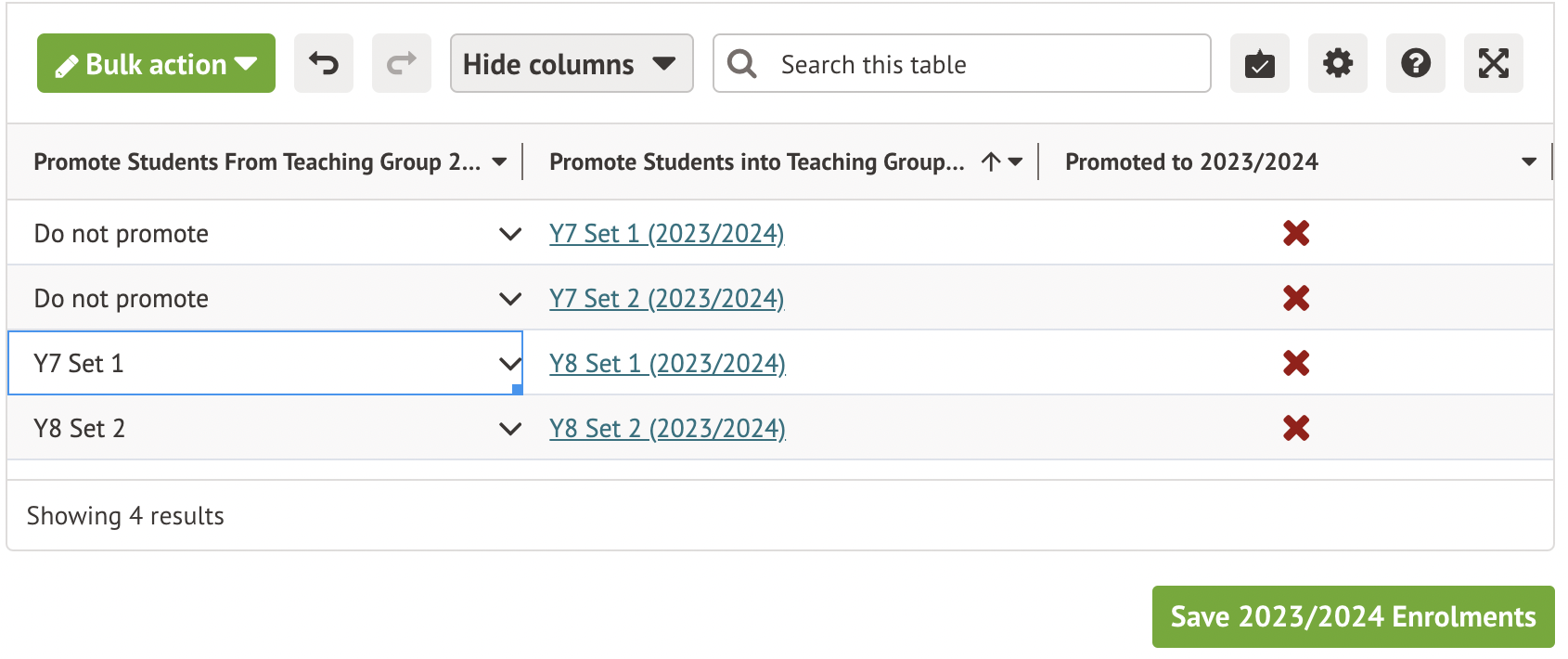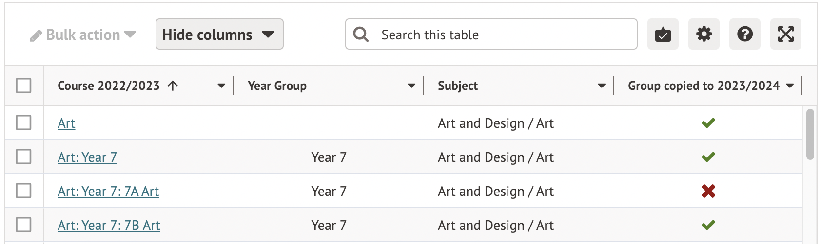 To remove any automatic enrolments set up in error, tick the box next to all the teaching groups you want to not copy over to the next academic year, then click the Bulk action button to select Bulk delete copied Course and Teaching Group mappings from the next academic year.