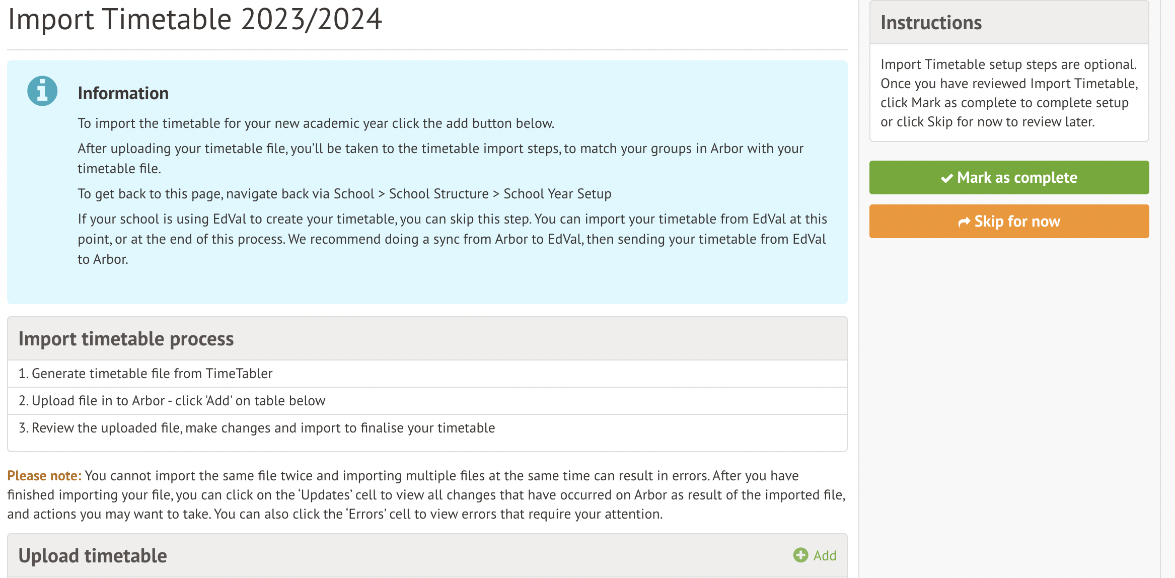 - Skip steps 1 and 2 and move straight to step 3 to import a brand new timetable for that academic year - this will create a new course structure in Arbor from the information in the imported TimeTabler file.