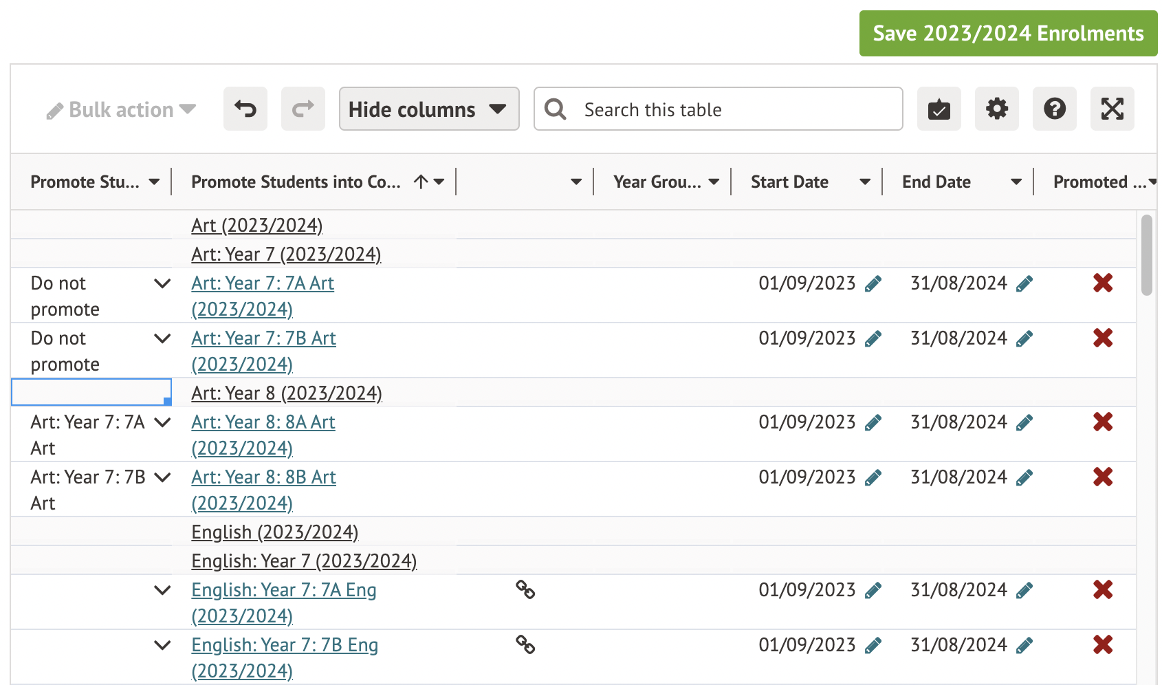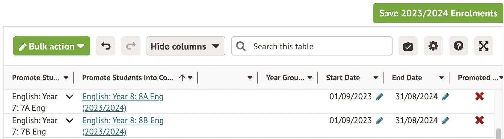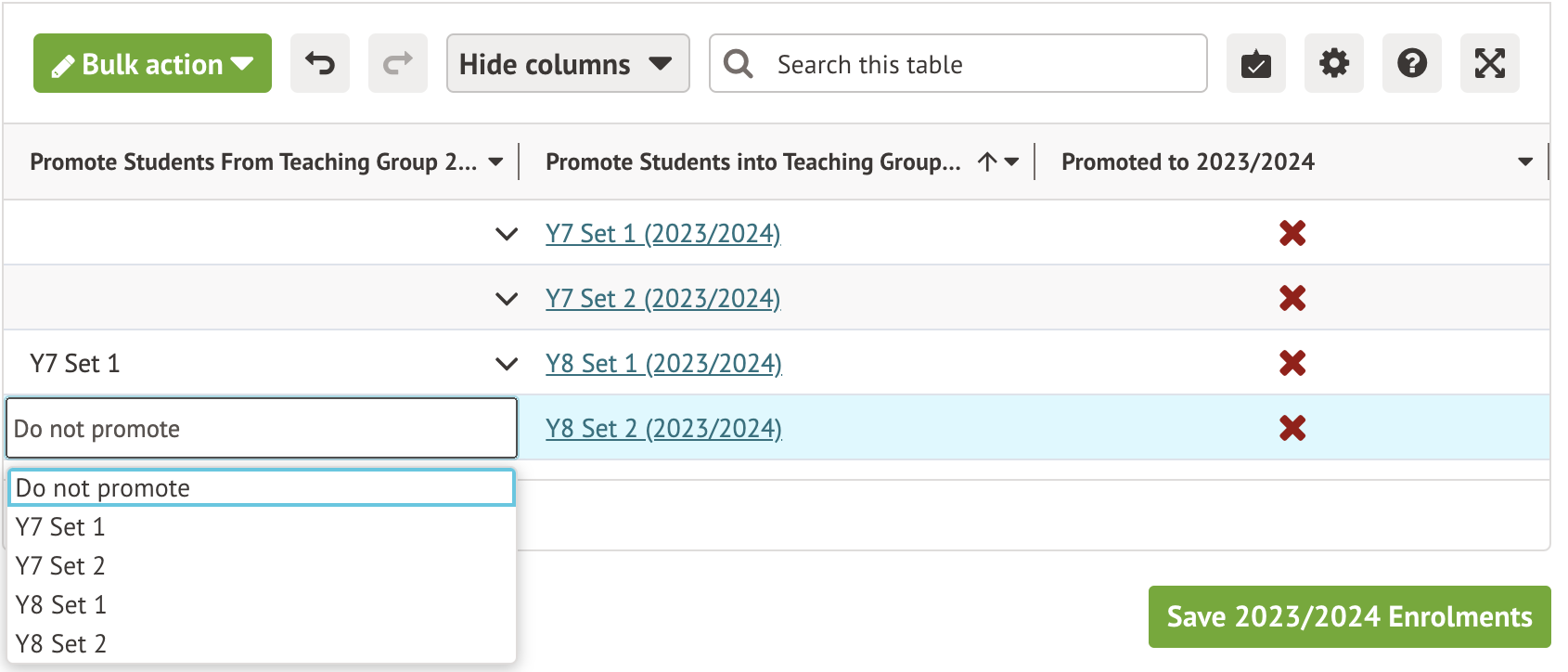 In the example below, as my Year 8 Set 1 class is automatically enrolled into English, and Year 7 Set 1 has been promoted into Year 8 Set 1 already, I won’t need to choose to promote the Year 7 class into the Year 8 one.