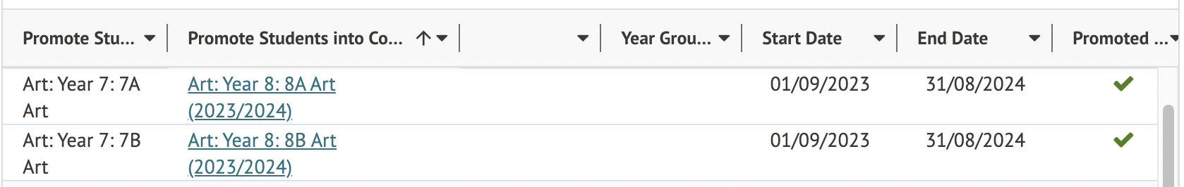 In the second column, you’ll see the course you’ve copied over to next year. In the left-hand column, pick the bottom-level course from this year that you want to move into the course for next year. For example, moving students from a Year 7 art class into the Year 8 art class for next year.