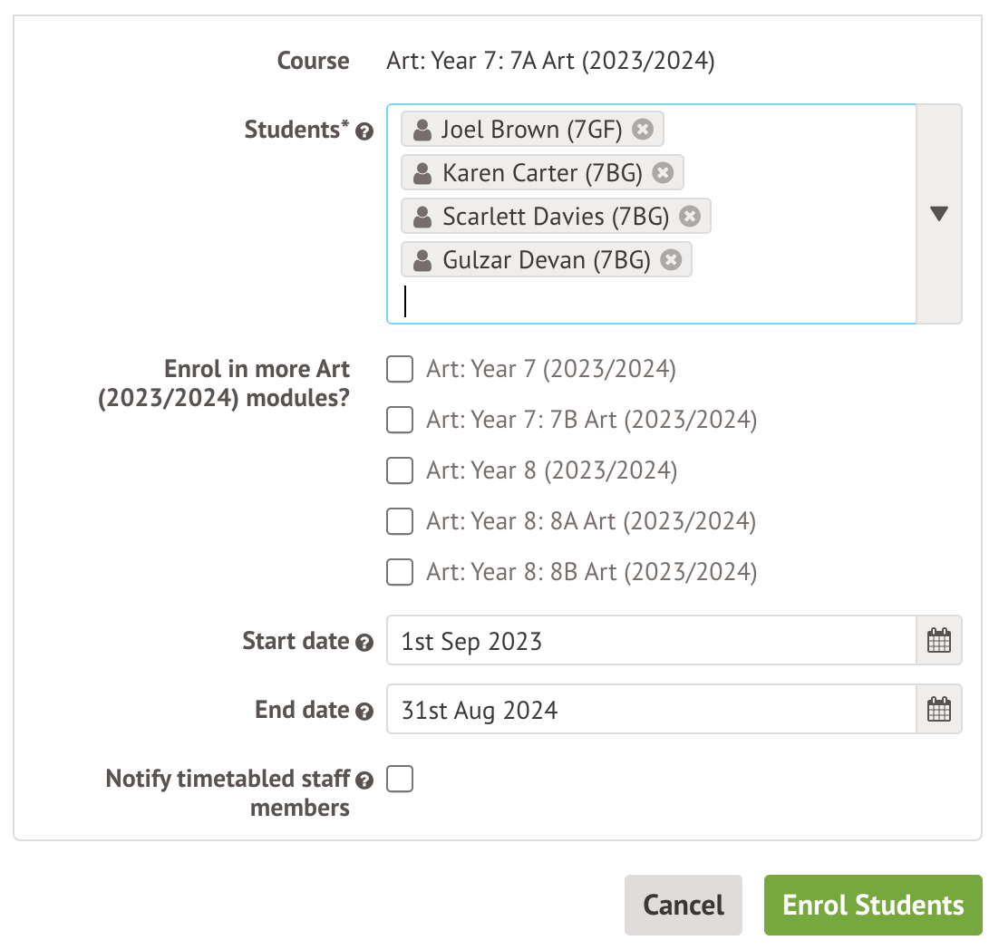 - If you don’t use Options or TimeTabler, we recommend using our bulk enrolment page by going to Students > Enrolment > Courses > Bulk Enrolment. You can see how to enrol students into their registers from here following this guide: Bulk enrol students into lesson registers