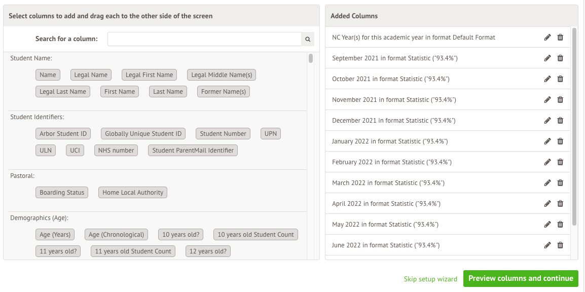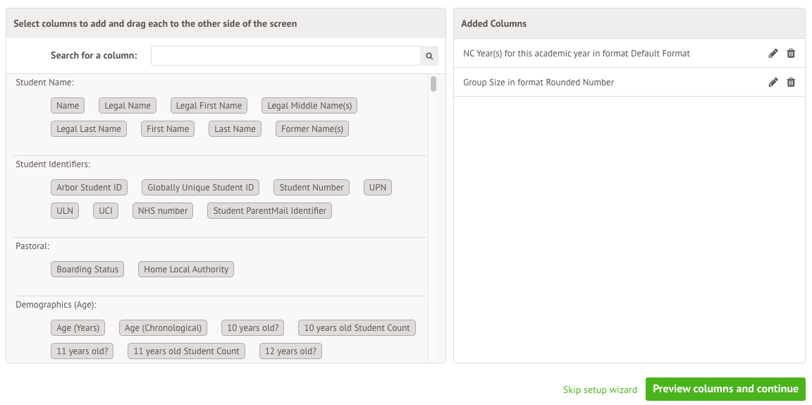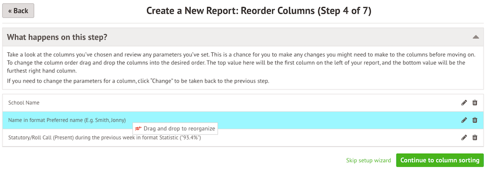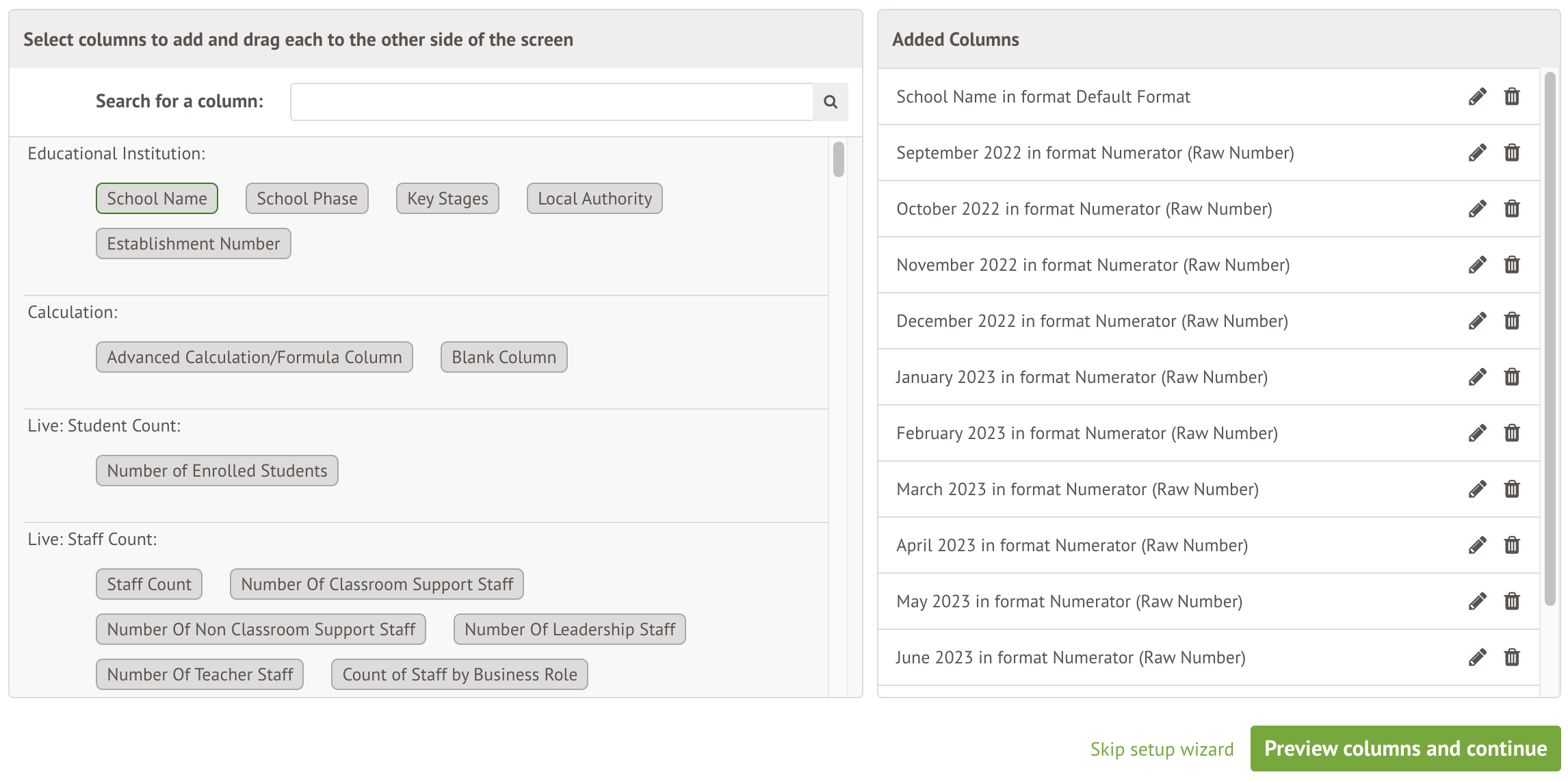 Top Tip: You won't need to add a column for school name as this will automatically be added to your report when you view it at the end of the setup.