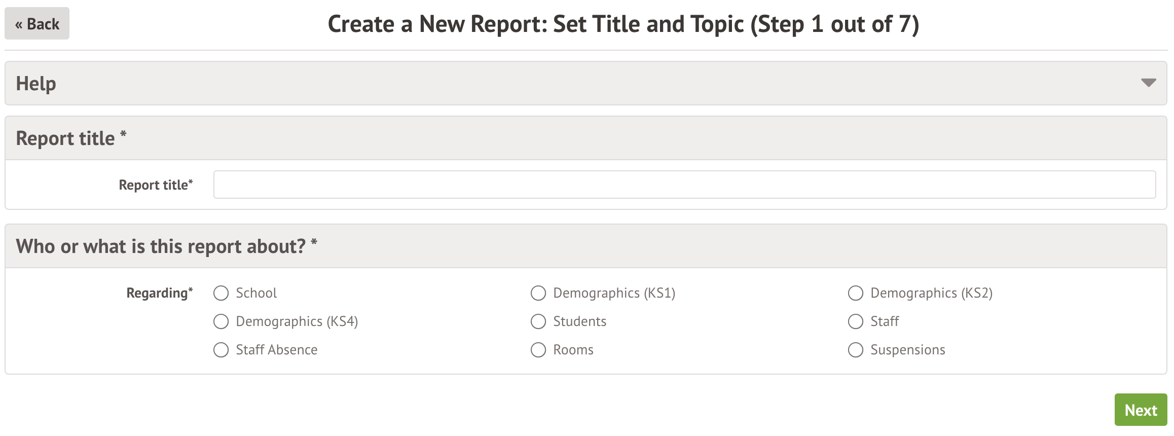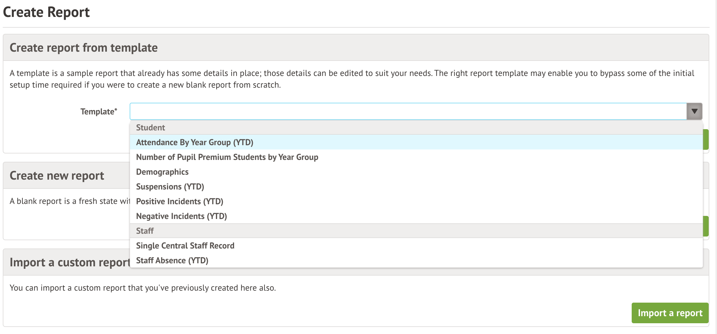 When adding a new report, you can select to use one of our out-of-the-box reports on Attendance, Pupil Premium, Demographics, Suspensions, Incidents and Staff Absences.