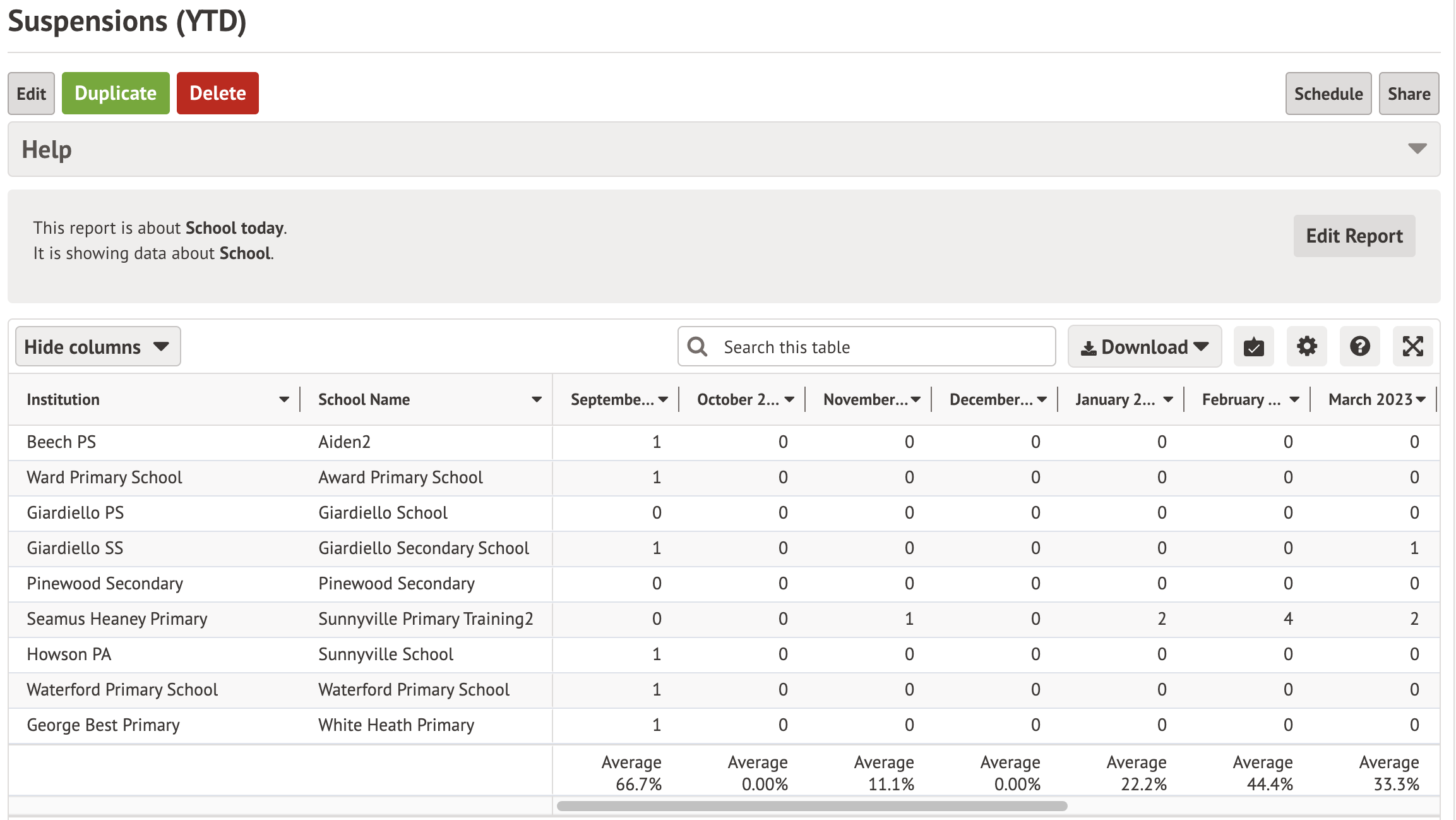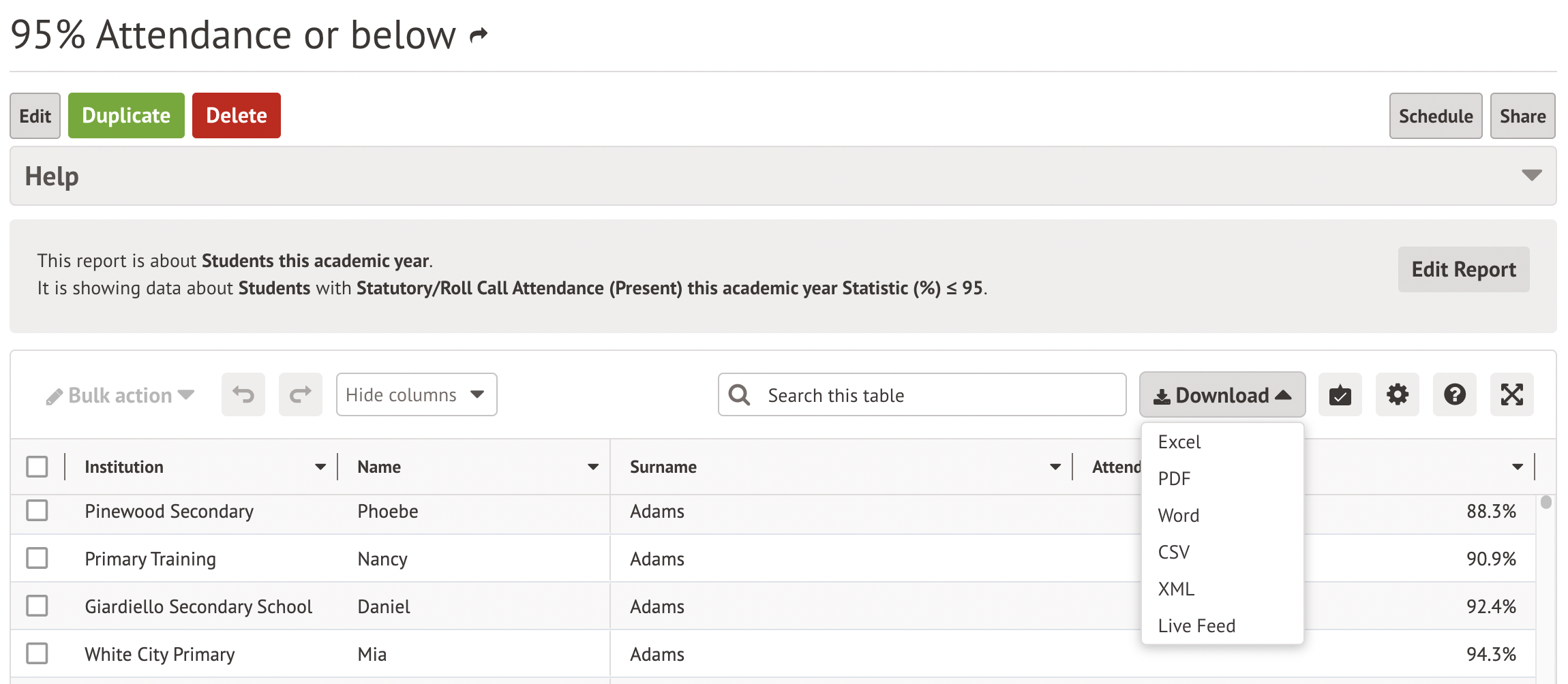 Once your report is created, you can share them with the right people in a variety of ways. Then agree on a plan with your schools, log in to take action or live feed the data out to Excel or Power BI.