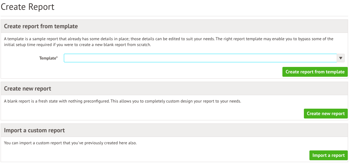From the All Reports page you can create a new report by clicking on the green 'Create New Report' button in the top right-hand corner of the page. There are 3 options.
