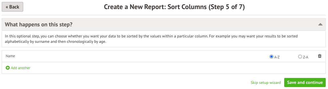 If you want your report not to show individual results but to group them together based on certain criteria you can choose this in this step. For example, you could group by 'institution' to see an average for any statistics for each school.