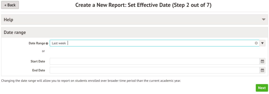 This is where you set the date range for your report. All reports must have a date range for which you wish to report upon your chosen topic. For example, you may only be interested in students who were enrolled last spring, or staff who were at your organisation last year.