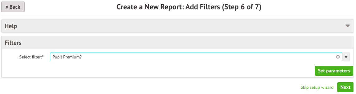 Adding a filter allows you to exclude certain people from your report. For example, you may only want to see students who are pupil premium. You do not have to set filters to create a report and this section can be left blank. You then need to save your filter by clicking Set parameters before you click Next.