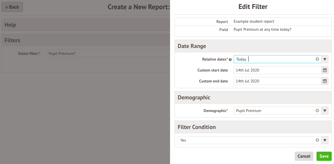 A slide over will appear after you have added filter, allowing you to set parameters. These parameters decide at what point in time you would like to look at, or how to present the data, such as only showing students who were pupil premium between certain dates.