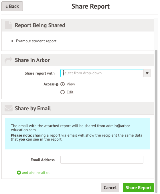 Go to the report you want to share and click the Share button to add this report to another MAT MIS user's All Reports page, or send it to them via email. You can either give a user full edit rights to the report or allow them to view the report. Sharing a report with another user gives them access to all the data in the report.