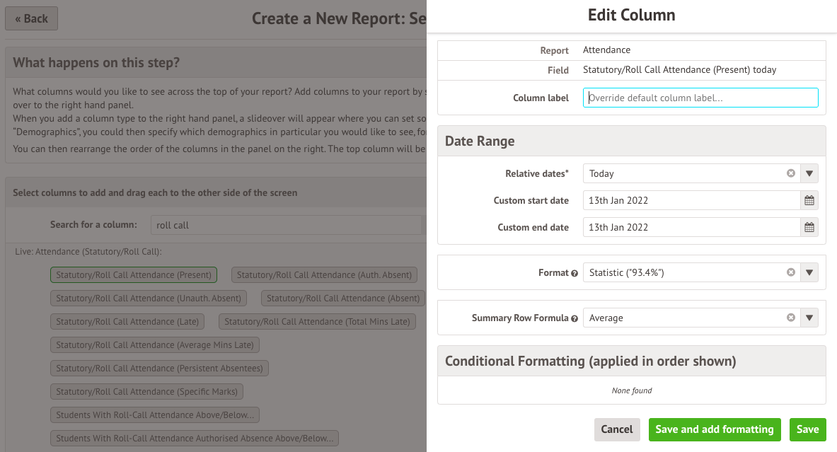 For example, to help you monitor student attendance across your trust and support specific students, added the Today’s attendance and Today’s notes columns. You can also add conditional formatting to colour-code your report.