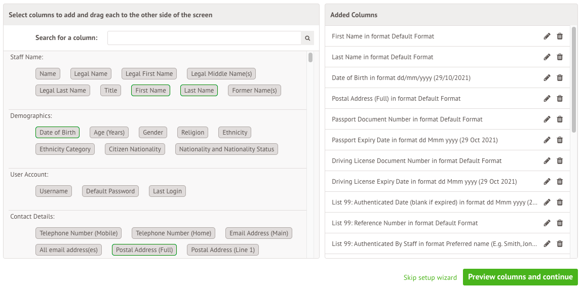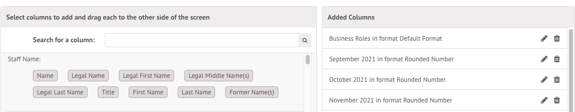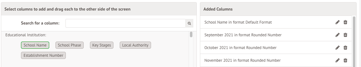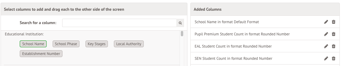 On the left hand of the screen, you can search for column titles in the search box or scroll through the list and select the columns you need. Drag and drop these into the right-hand side.
