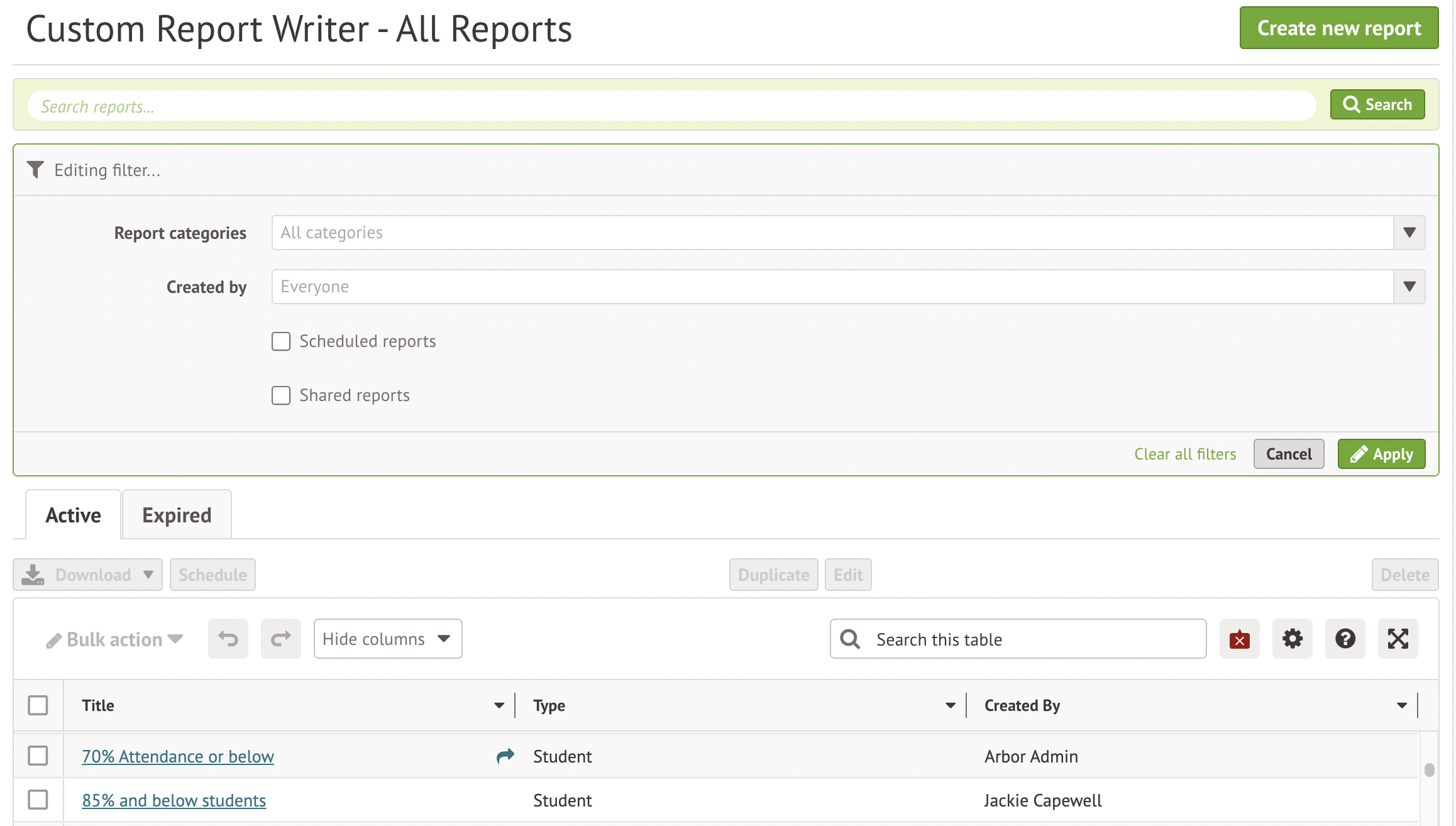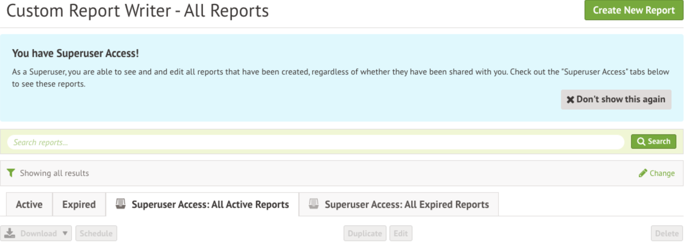 When you go to Analytics > Custom Report Writer, the first page you'll see is the All Reports page. You can search for a report title by clicking in the green search box or add criteria using the filters.