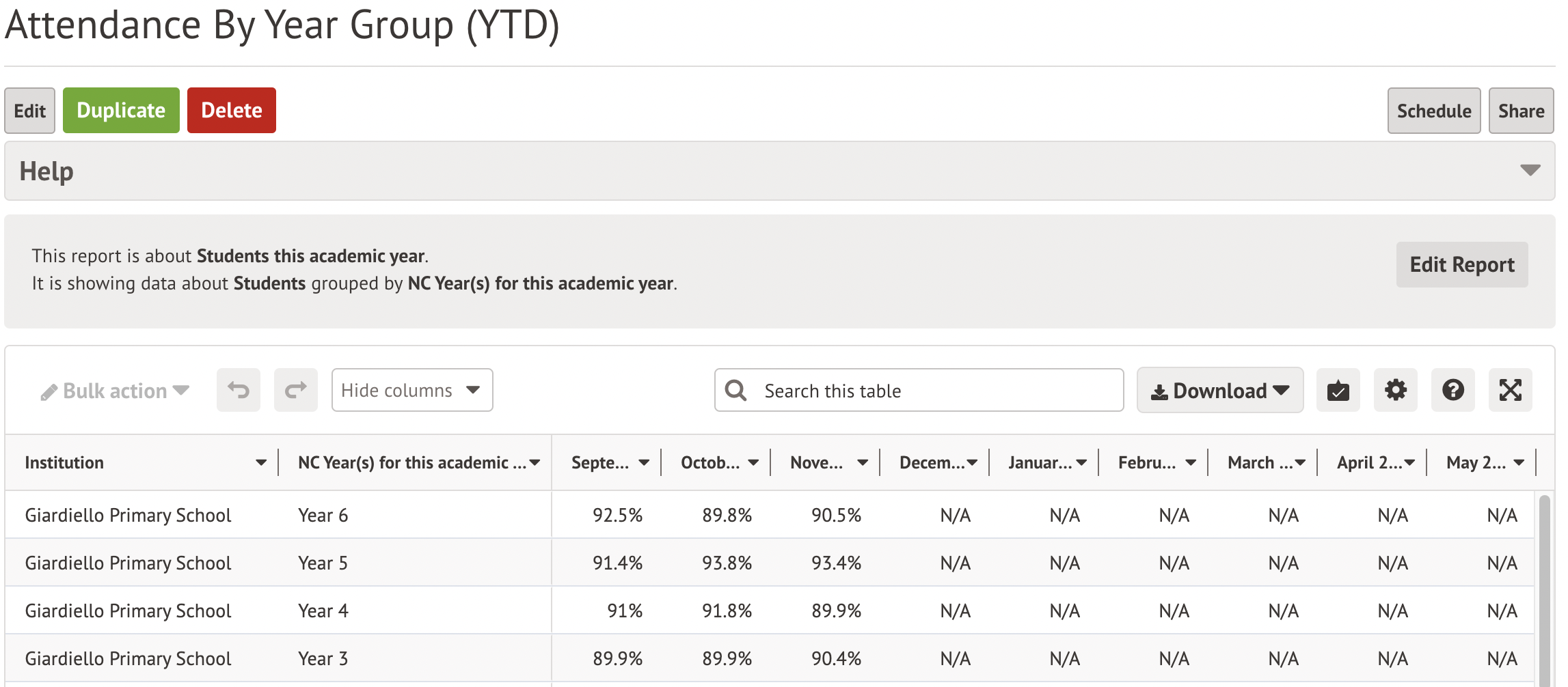 Click Skip setup wizard then Save and view report to see a report for each year group's attendance for each month.