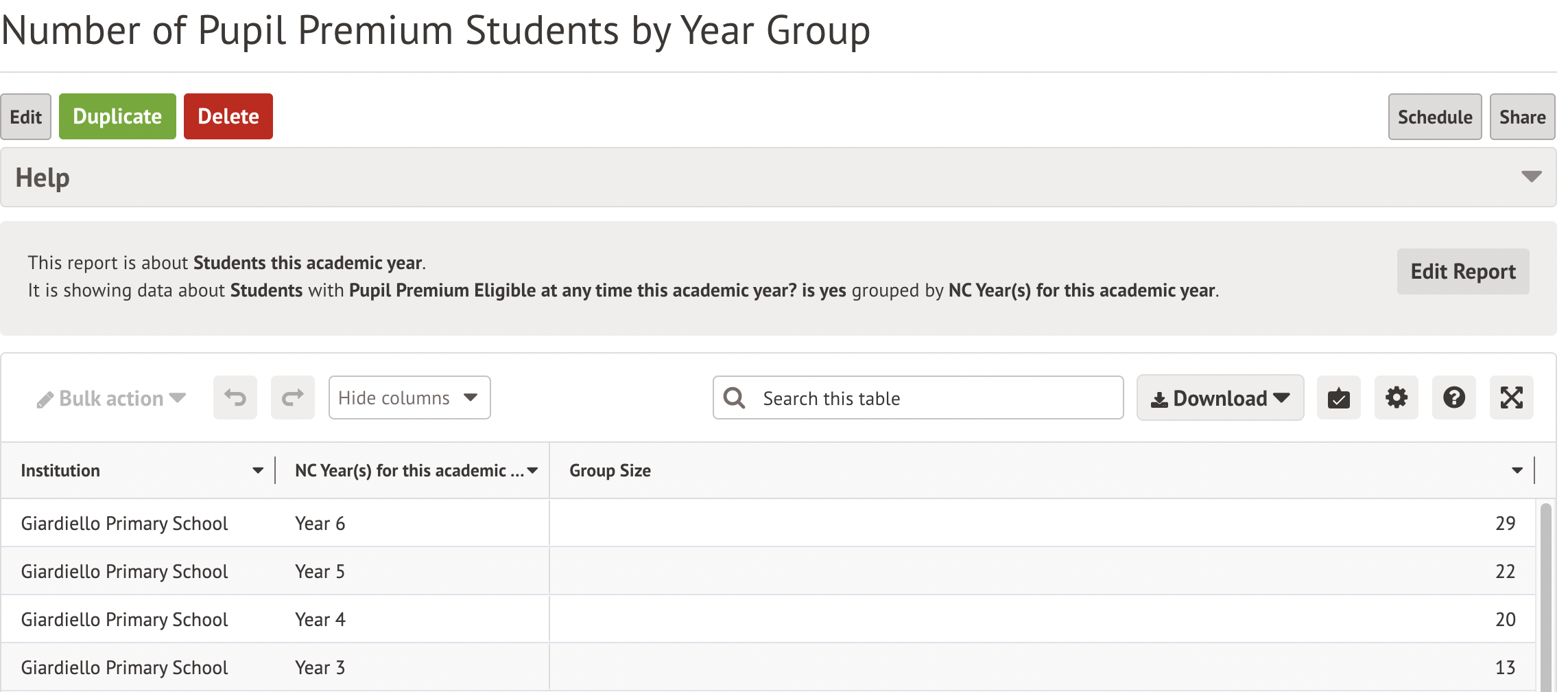 Click Skip setup wizard then Save and view report to see a report of the number of Pupil Premium students in each year group this year.