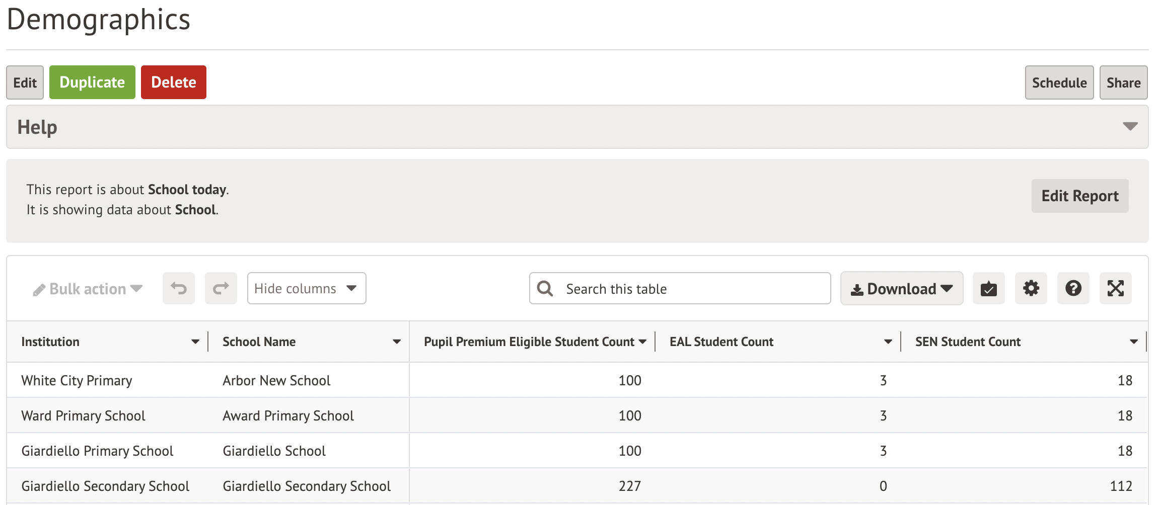 Pull in data from all your schools to report on, and sort, filter or group the report based on student demographics to highlight any missing information or see what can be improved at your MAT. You can also add conditional formatting to colour-code your report.