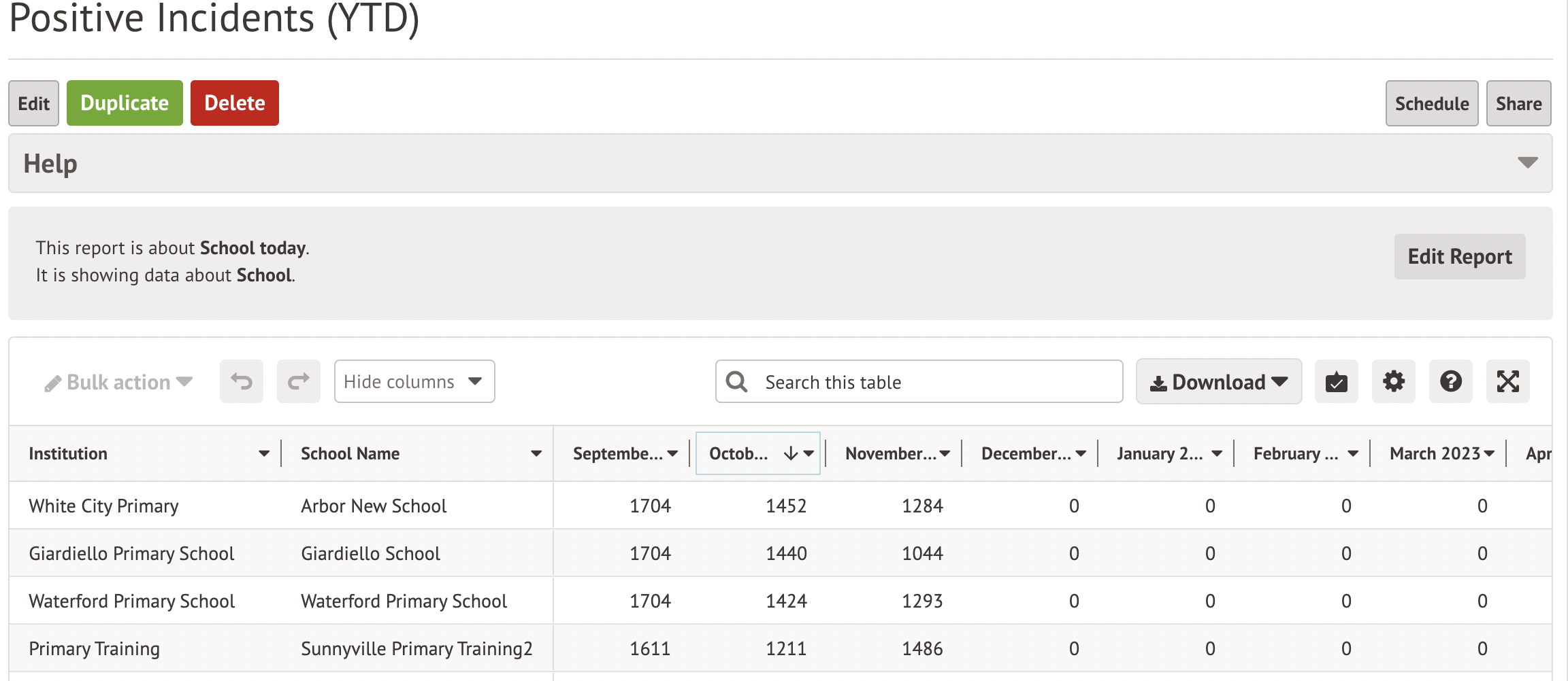 Click Skip setup wizard then Save and view report to see a report of incidents during each month for each school.