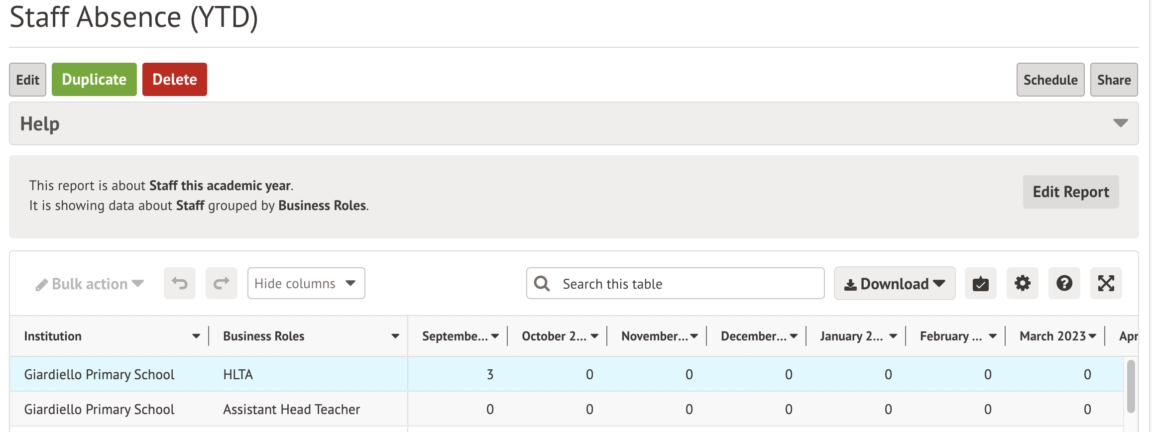 Click Skip setup wizard then Save and view report to see a report of your schools' staff absences for each role type for each month.
