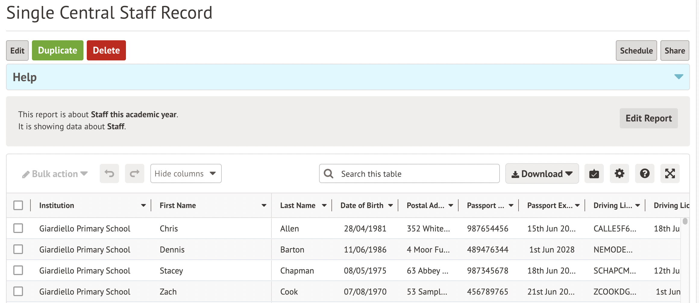 You can create a custom Single Central Record (SCR) in the Custom Report Writer if you want to add additional columns that aren't included in our out-of-the-box Single Central Record (SCR).
