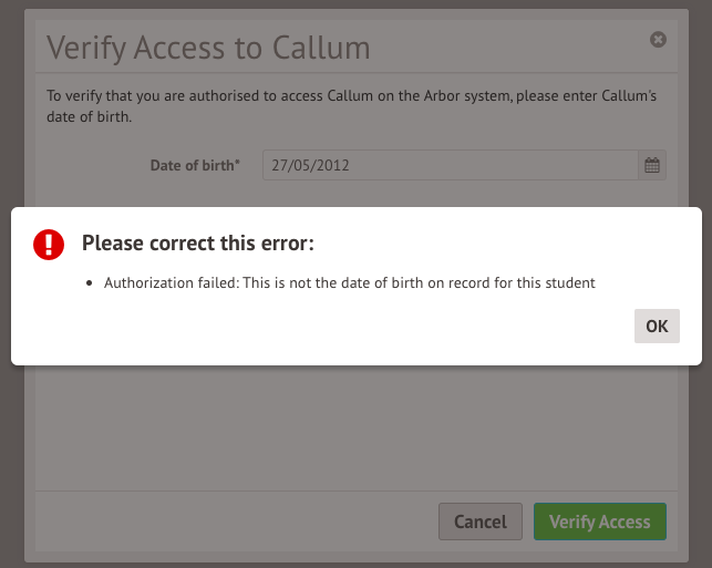 If the authorisation fails (even though the date of birth is correct), or when you log in the page is blank or you can't see the right student, this means the guardian hasn't been linked to the student. You'll need to follow the instructions in this article to link them.