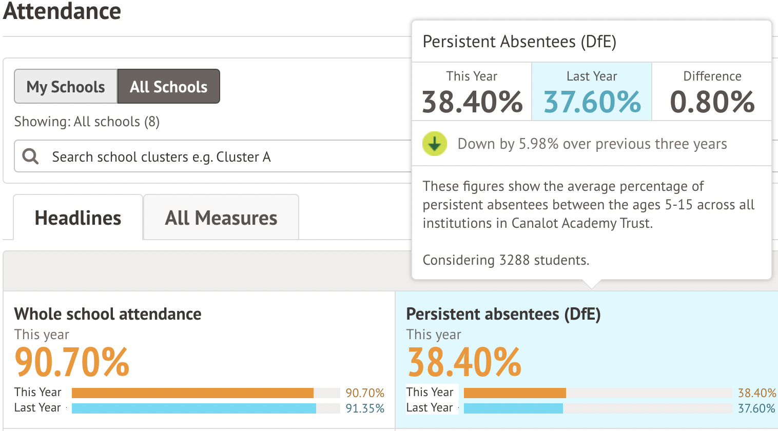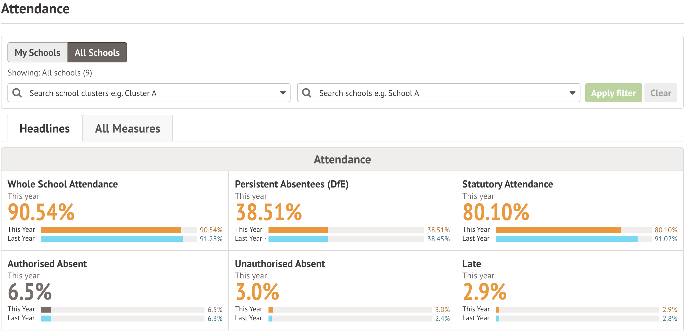 - This Year and Last Year figures - These figures include all students who have a valid attendance mark at any of the schools in the trust for the Academic Year